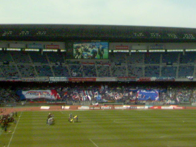 代表戦とかでは結構行ってるが、ハマラジの試合で日産スタジアム行くのは、もしかして(日産スタジアムになってからは)初めて?最後にリーグ戦で行ったのが確か、2003年4月のV仙台戦。あのときは、バック2Fで応援できてたっけ。しかし、今回はアウェイ側ゴール裏1Fのみ、しかも完全隔離。