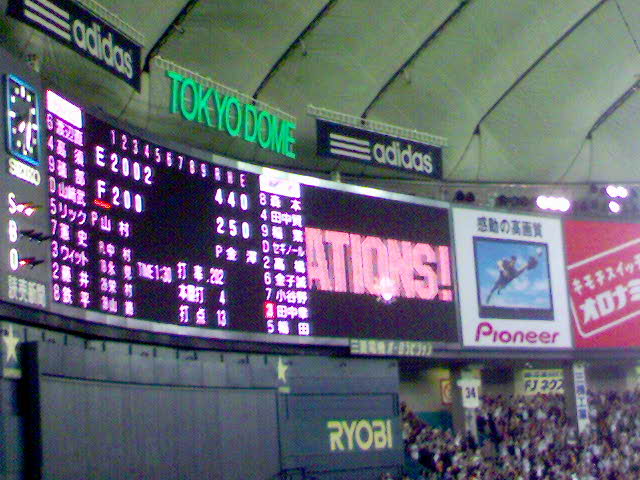 「東京ドームに金を一切落とさない」。これは無事?!達成。あとは、もう一つの裏テーマとして、どこの中学校が修学旅行に来るか?というのがある(爆)。しかし、「修学旅行で野球観戦」というのは、正直「修学」という点でどうなのよ、と思うのだが。この辺は当事者(謎)の意見を伺いたいところ。だったら、TDLなんか???だし(いや、俺自身、東京に修学旅行行ったのが、TDLオープンの4日前だったので、TDLに行けなかった(俺たちより1ヶ月後に修学旅行に行った、多○城○中とか、同じ中学でも俺の後輩とかはみんな行ってる)から僻んでいるというのはここだけの話。