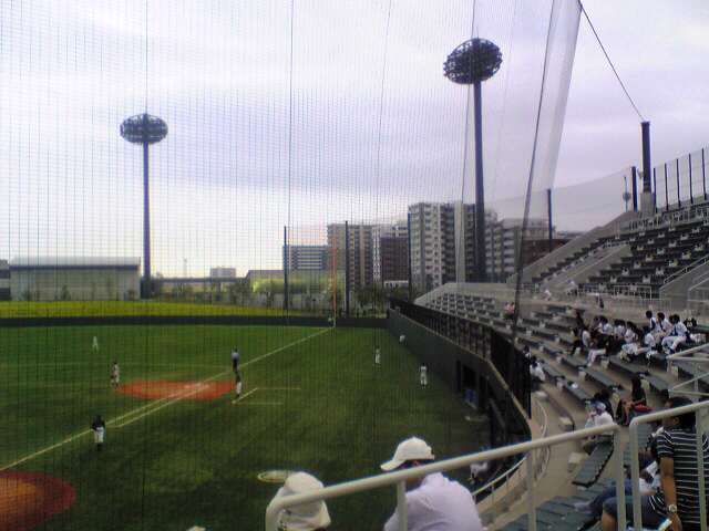 人工芝は宮城球場と同じもの。両翼100、センター122。ネックは、ここも鳴り物禁止。すぐ斜め前にマンションが。