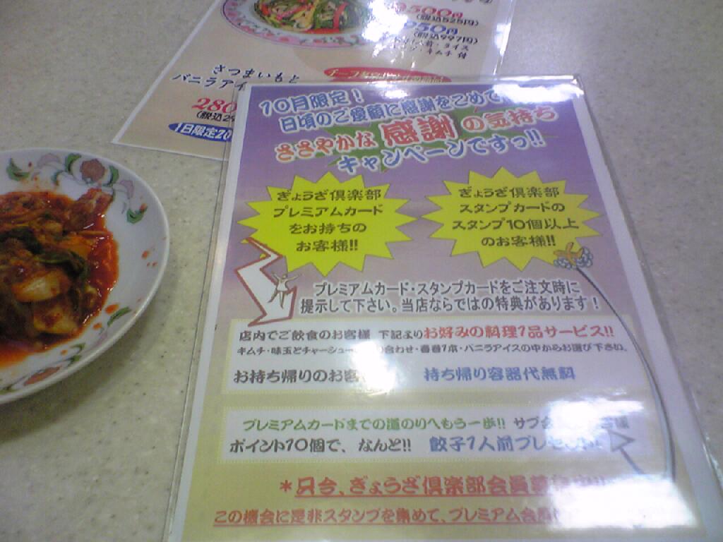 2008年10月18日 餃子の王将 平塚店にて。。。 ブログネタ:中華料理 に参加中! 帰りは平塚で途中下車。 今はぎょうざ倶楽部のスタンプカードキャンペーン中なのだが、それに加えて平塚店独自の10月限定キャンペーン。 プレミアムカード所持者に料理一品サービス! スタンプカードのスタンプ10個以上所持者に餃子一人前! 両方とも該当する俺。 天津飯にキムチをつけて、ポイント一個(500円)稼ぐのが精一杯だったとさ。↓の評価ボタンを押してランキングをチェック! 人気blogランキングへの投票お願いします。10/18現在43位。週間IN110 週間OUT100 月間IN550 「食事」カテゴリの最新記事 タグ :#餃子の王将 < 前の記事次の記事 > コメント コメントフォーム 名前 コメント 評価する リセット リセット 顔 星 投稿する 情報を記憶 トラックバック