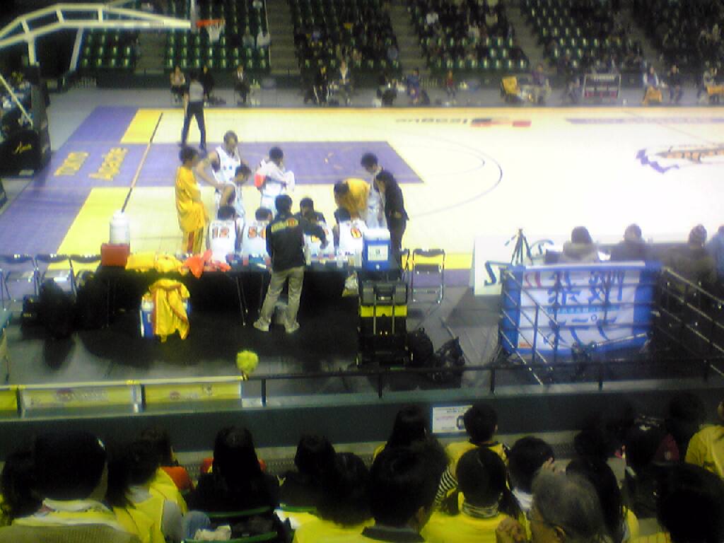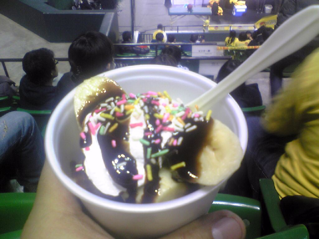 「飲食物持ち込み禁止」の悪名高き、有明コロシアム。しかし、今日は悪名高き?!(Kスタの悪い点だけ真似した?!)手荷物検査なかった。写真3枚目は、試合中に売りに来たチョコバナナ、400円。