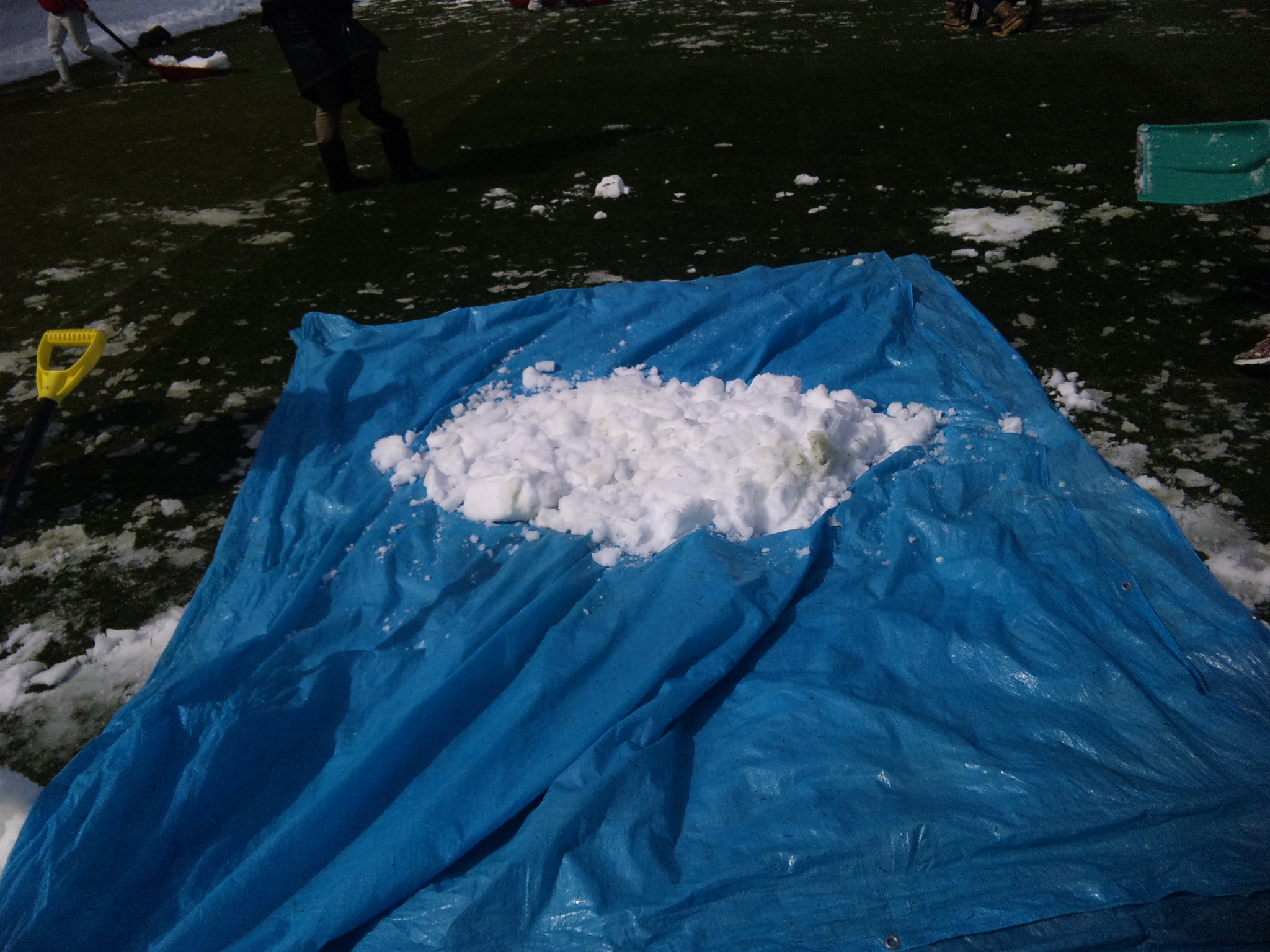 雪かき用のスコップは持参して、あとは雪を運ぶためのビニールシートが足りなかったかな、という感じ。帰る頃には、全体の6割くらいは雪かき完了していて、スタッフは泉サッカー場へと移動していた。