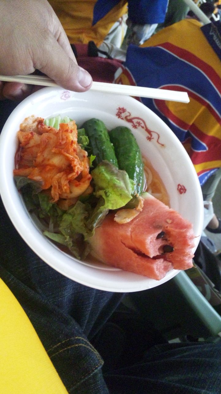 着いたのがキックオフ直前。サンプラザからバイクで移動してきたので、夕食食べようとしたら、バックスタンドの弁当とかの類が全滅状態・・・かろうじて、南側で冷麺600円があったので試してみるが、・・・きゅうりとスイカがでかすぎて・・・