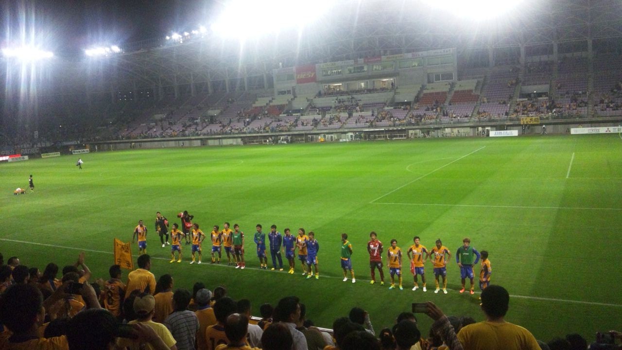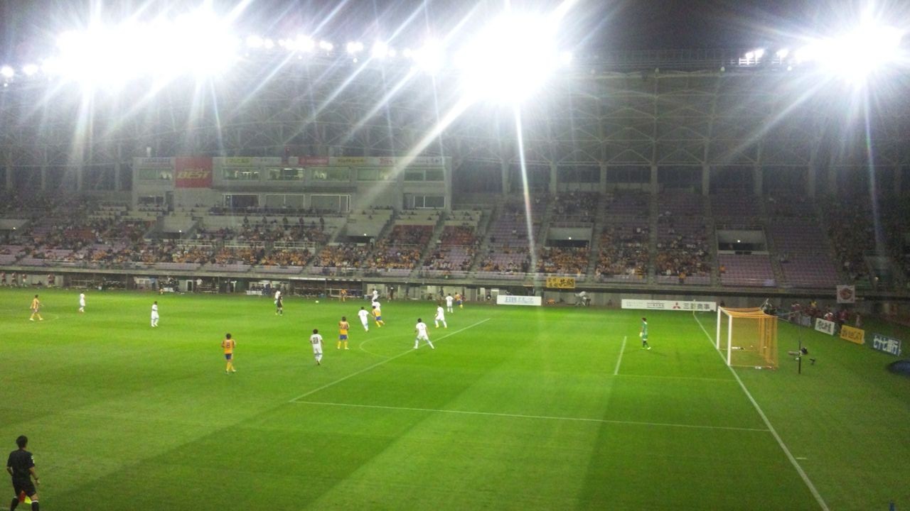 着いたのがキックオフ直前。サンプラザからバイクで移動してきたので、夕食食べようとしたら、バックスタンドの弁当とかの類が全滅状態・・・かろうじて、南側で冷麺600円があったので試してみるが、・・・きゅうりとスイカがでかすぎて・・・で、立ち上がりのウイルソンの先制点、右サイド一人で持ち込んでの崩し、お見事。