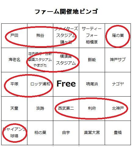 野球編。一枚目が、一軍開催地ビンゴ。(一軍公式戦に限らなければ)残るが旭川、秋田、松山、北九州(沖縄セルラーは改修前に)。旭川か・・・そうか、8月にイーグルスが行くんだな・・・