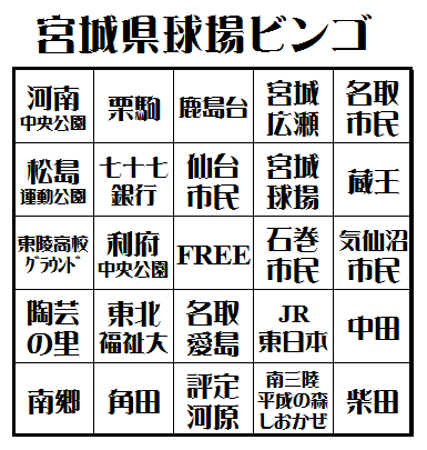 で、三枚目が(俺が焚き付けて作ったw)宮城県球場ビンゴ。気仙沼市民とか、愛島とか、今は亡き球場までwww