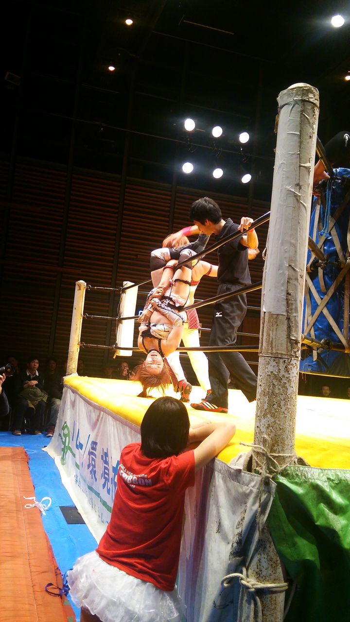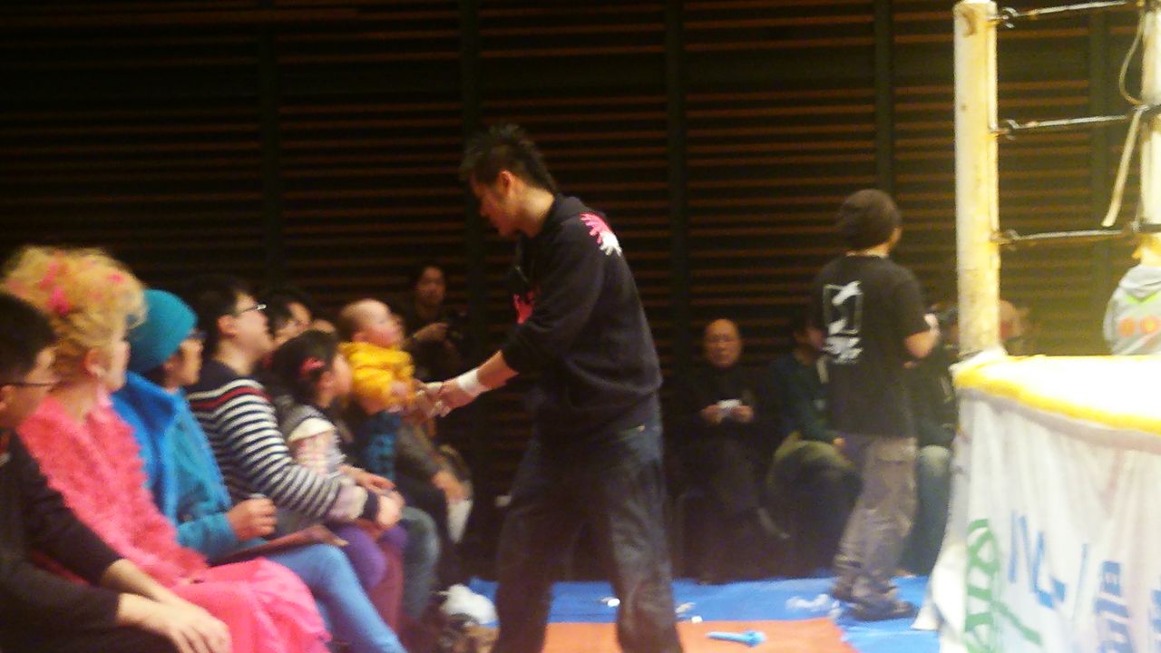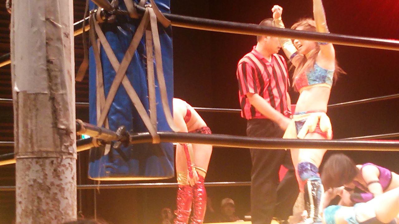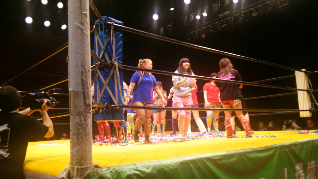 で、試合は場外乱闘あり、空中戦ありではあったが、最後はマッスルビーナス(蹴り技)2連発で、藤本が世羅をフォールし、仙台大会を締めた。