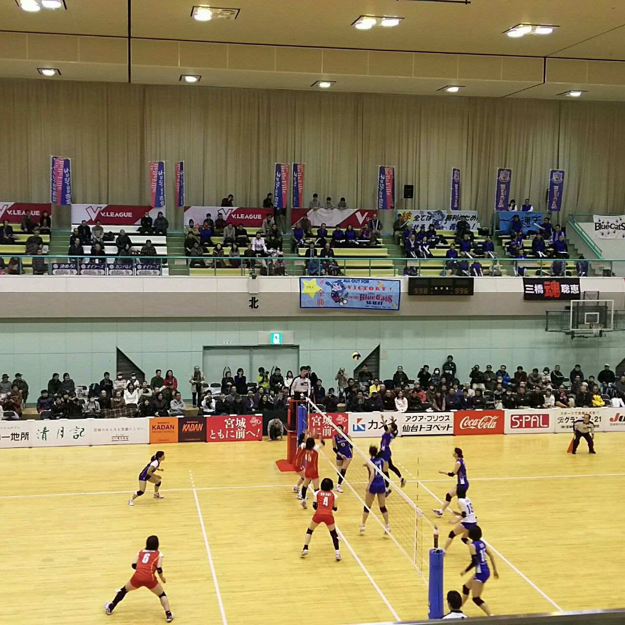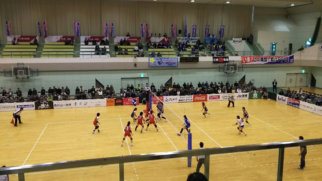 ◎V・チャレンジリーグ1女子 2015/16レギュラーラウンド 試合番号653 PFUブルーキャッツ(青)vs大野石油広島オイラーズ(赤) 2016年1月30日(土)13時 富谷スポーツセンター 主審:早坂行博(宮城) 551人 1時間35分