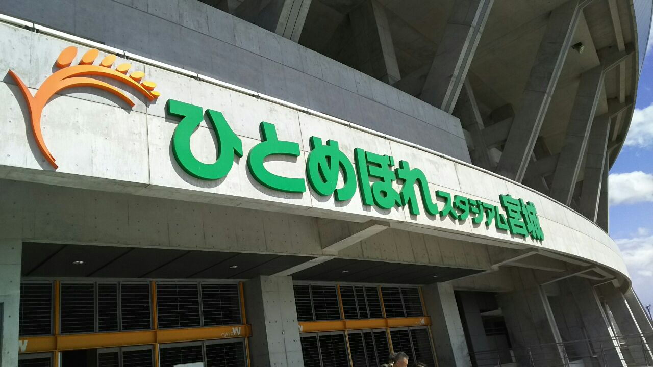 宮城スタジアムは、去年からネーミングライツで「ひとめぼれスタジアム宮城」となったが、それ以来俺が来るのは初めて。しかし風が強い。正面の駐車場にバイク止めて、入口まで歩くが、風強くて絶望的に。。。