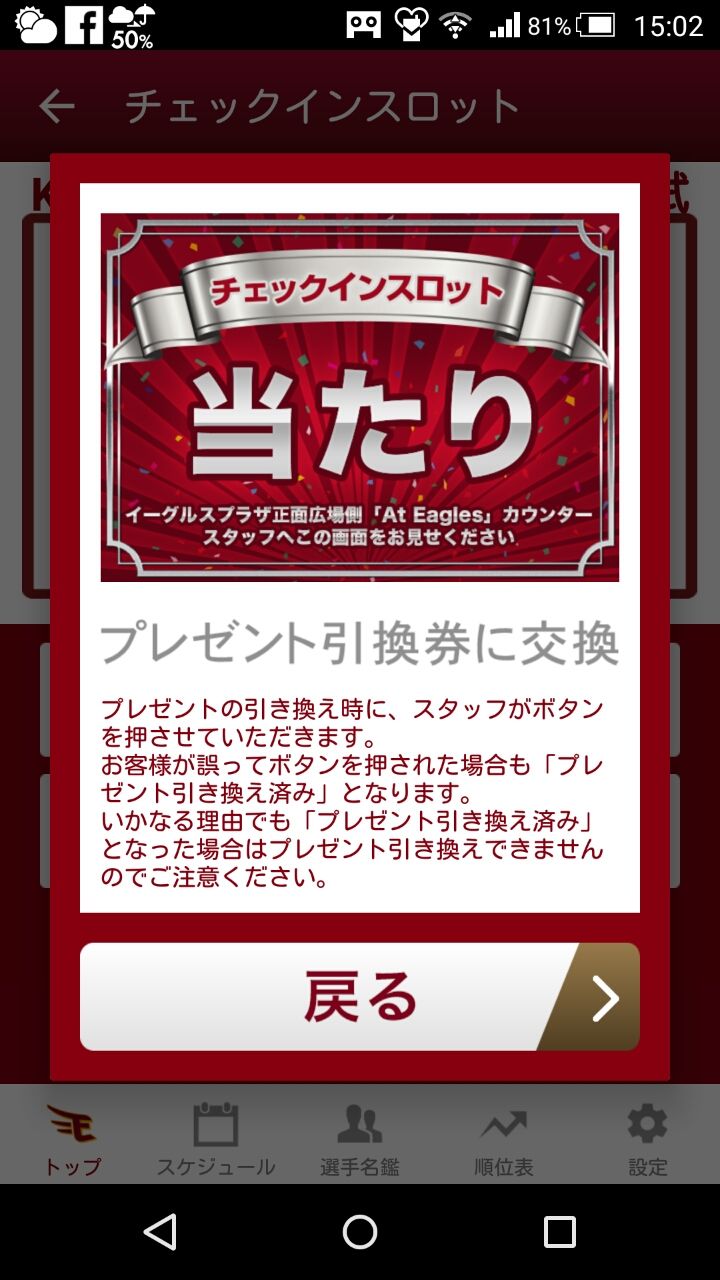 試合前。AtEagles(スマホアプリ)でやってるチェックインスロットで、3年目にして初めて当選した。