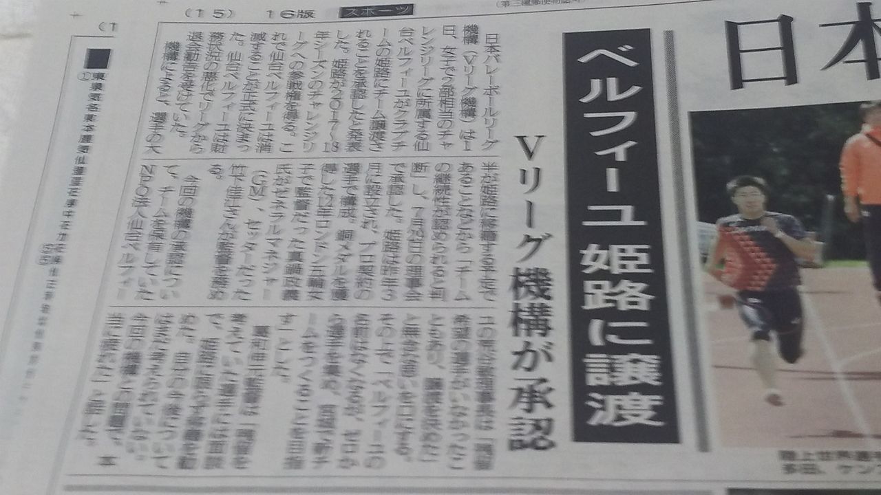 日本バレーボールリーグ機構(Vリーグ機構)は1日、女子で2部相当のチャレンジリーグに所属する仙台ベルフィーユがクラブチームの姫路にチーム譲渡されることを承認したと発表した。姫路が2017〜18年シーズンのチャレンジリーグへの参戦権を得る。これで仙台ベルフィーユは消滅することが正式に決まった。仙台ベルフィーユは財務状況の悪化でリーグから退会勧告を受けていた。