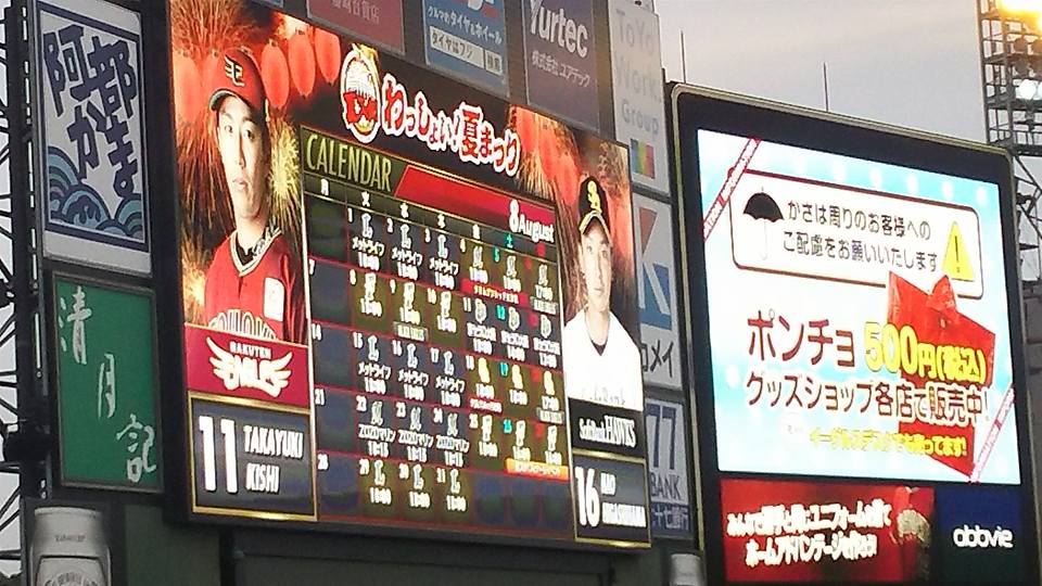 ○アッヴィマッチナイター プロ野球パシフィックリーグ公式戦 東北楽天ゴールデンイーグルスvs福岡ソフトバンクホークス 16回戦(東北9勝7敗) 2017年8月18日(金)18時 県営宮城球場 曇のち雨 球審:木内九二生 25694人(グリコパーク以外完売っぽかったが満員御礼は出ずらしい)