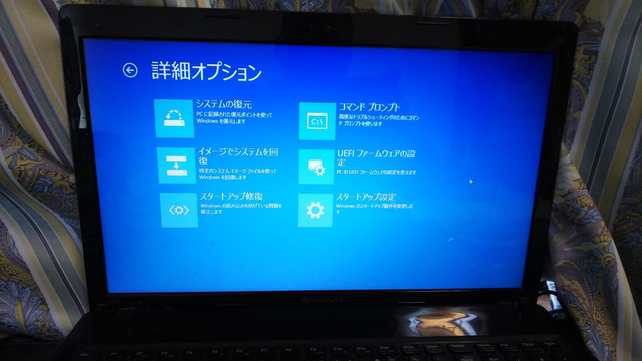 電源は入って、Lenovoのロゴは表示されるが、その先が進まない。セーフモードで起動もできない。