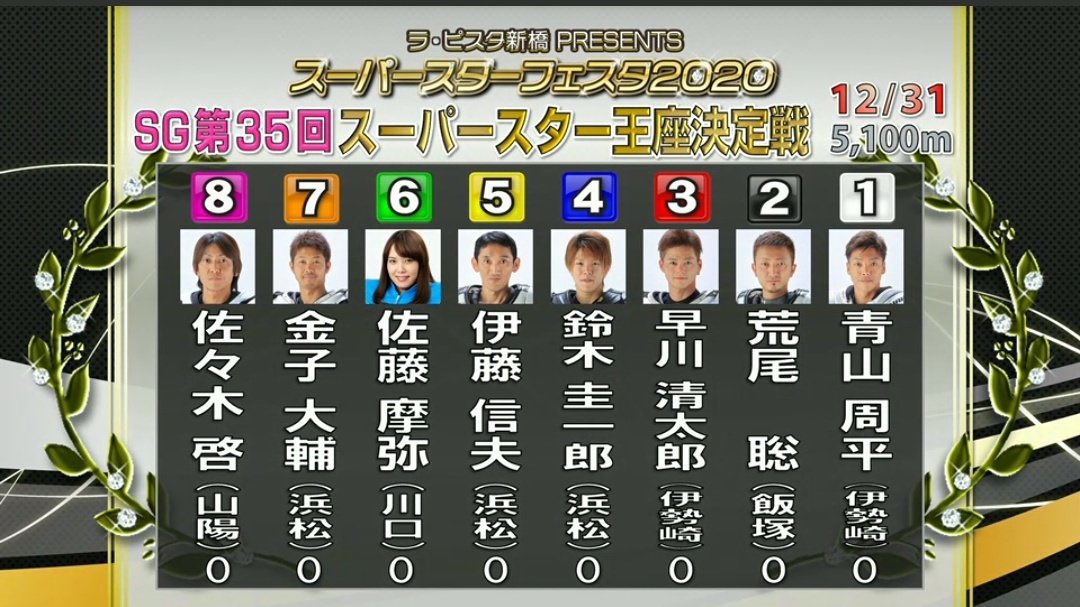◎ラ・ピスタ新橋カップ スーパースターフェスタ2020 川口オートレース12R SG第36回スーパースター王座決定戦 12月31日(木)17時40分 5,100m(10周戦)0ハン