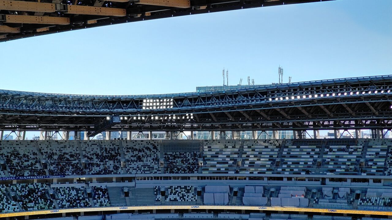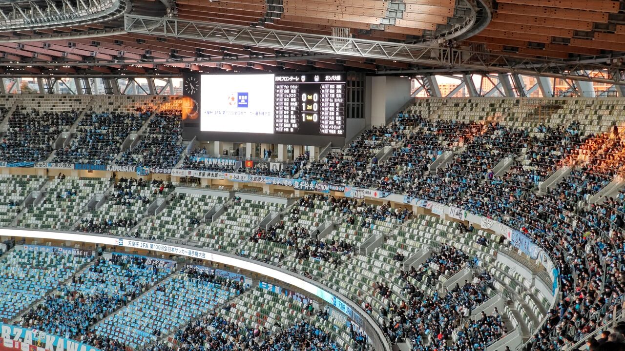 今年の天皇杯のフォーマットは特殊で、J1の優勝・準優勝チームが準決勝から出場する。で、フロンターレ、ガンバともにJ3優勝のブラウブリッツ、J2優勝のヴォルティスを破って、決勝の舞台へ。新・国立霞ヶ丘競技場。俺は初めての参戦。数えてみれば、改装前の旧・国立には143試合来たわけだが、約10年以上ぶり。すっかり変わったな。。。今日は3層目の、上から3段目(20列目)。SB席(5000円、先行発売)だったが、中央近くだったんで、見晴らしはいい。
