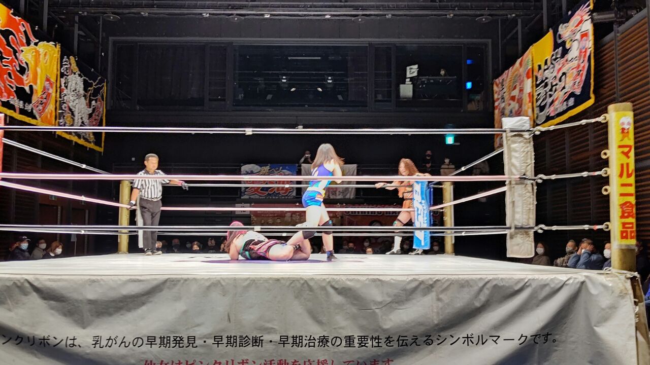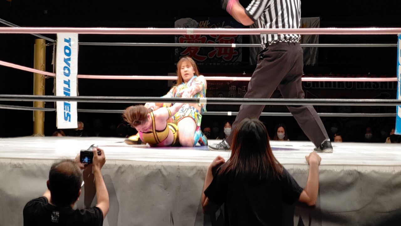 ○松本浩代、愛海(愛海 14分22秒 逆エビ固め カノン)橋本千紘、カノン×
