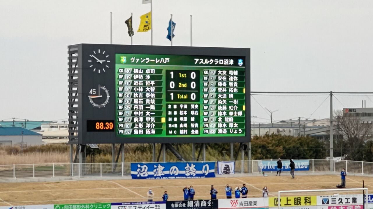 【得点】33分(八戸)中村 太一(右後方丹羽からのクロス→H)【ヴァンラーレ八戸】GK23横山卓司 DF32伊勢渉、39近石哲平、16小林大智 MF4前田柊(→75分MF44秋吉泰佑)、30黒石貴哉、27丹羽一陽、7中村太一、14前澤甲気 FW9上形洋介(→90+2分MF8高見啓太)、11岡佳樹(→75分FW19島田拓海)SUB:GK33蔦颯、DF24原山海里、MF48相田勇樹、FW18佐々木快 監督:葛野昌宏