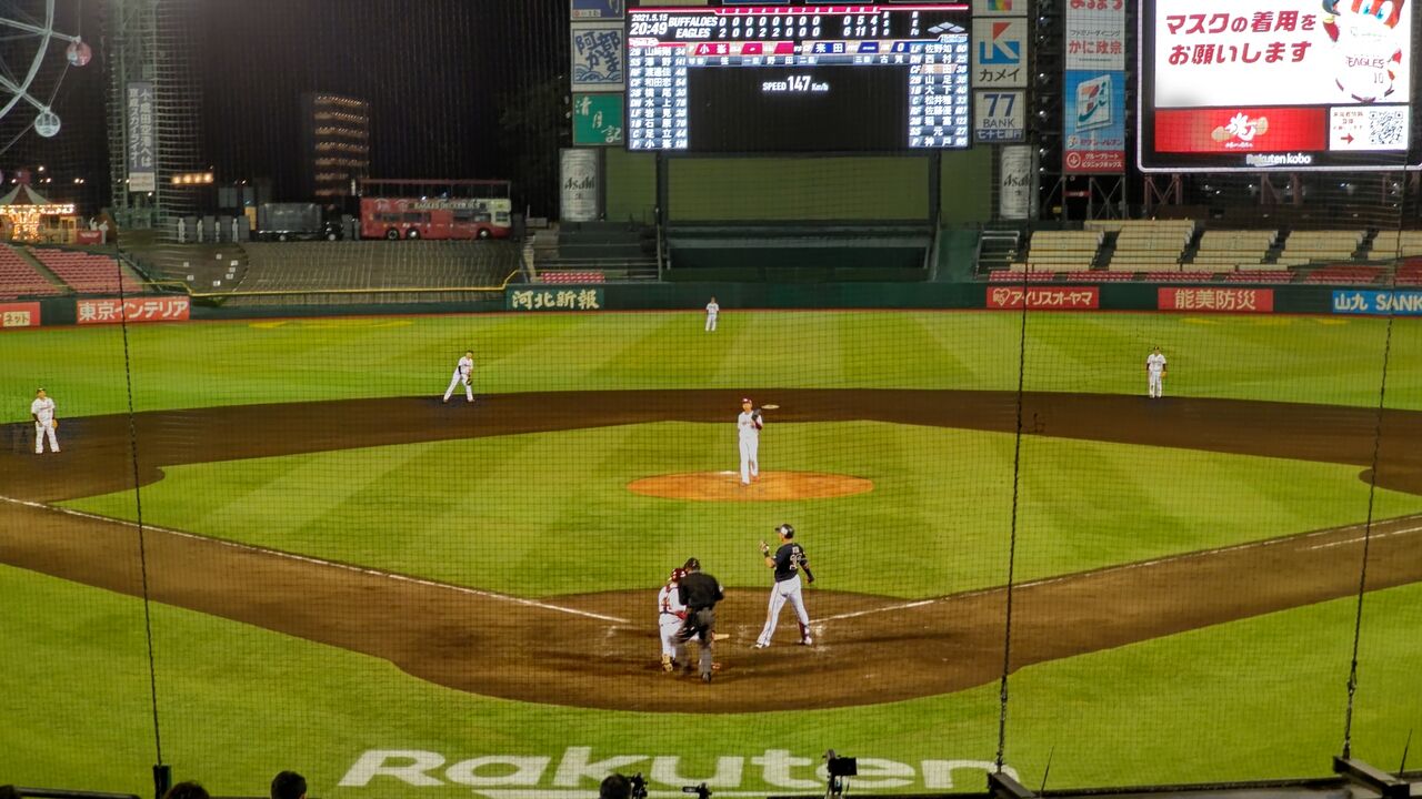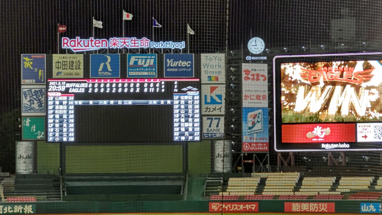 場内アナウンスでは、(まん防発令の5/11までと同様に)アルコール18時45分まで、その他飲食19時45分まで、となっていたが、実際は20時過ぎても、ホットコーヒーの売り子が場内を走り回っていた。◎プロ野球ファーム交流戦 東北楽天ゴールデンイーグルスvsオリックス・バファローズ 1回戦(東北1勝) 2021年5月15日(土)18時 県営宮城球場 曇 球審:笹真輔(育成)塁審:野田亮介、古賀真之 1043人