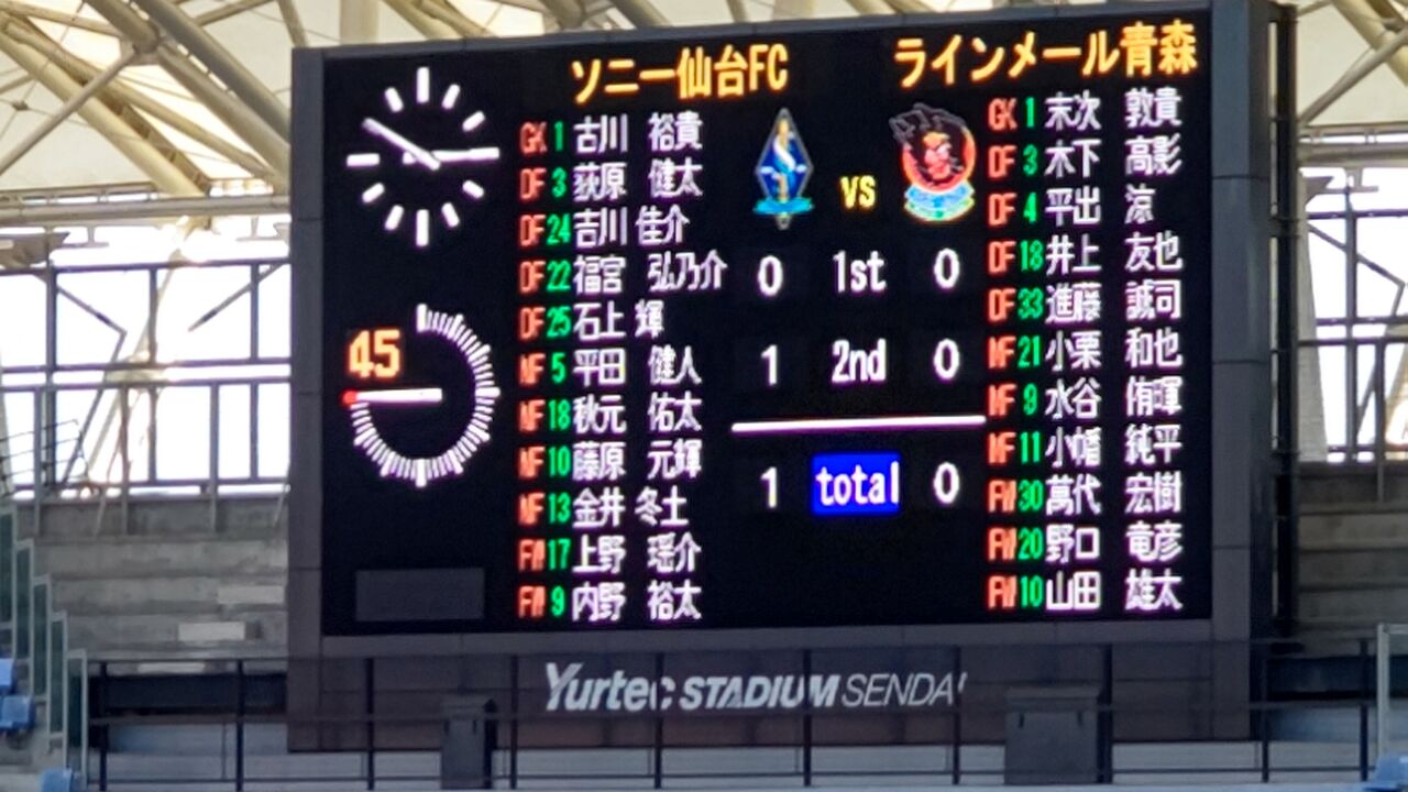 【ソニー仙台FC】GK1古川裕貴 DF3荻原健太、16松本拓海(→82分DF24吉川佳介)、22福宮弘乃介、25石上輝[1/0] MF5平田健人[2/0]、7吉森恭兵(Cap.(→34分MF18秋元佑太)、10藤原元輝[1/0]、11佐々木敦河(→HTMF13金井冬士)、15鈴木啓太郎(→74分FW17上野瑶介[-/1]) FW8佐藤碧[1/0](→74分FW9内野裕太[-/2])SUB:GK21鴨川優斗、MF14吉野蓮 監督:中村元【ラインメール青森】GK1末次敦貴 DF3木下高彰、4平出涼、13唐澤真三郎(→62分DF18井上友也)、33進藤誠司 MF8榊原彗悟[3/0](→70分MF21小栗和也)、9水谷侑暉[0/1]、11小幡純平(Cap.)、25差波優人[1/1](→70分FW30萬代宏樹[-/1])、28菊岡拓朗[1/-](→32分FW20野口竜彦) FW10山田雄太[0/1] SUB:GK17廣末陸、DF41後藤京介、MF5西山大雅 監督:安達亮