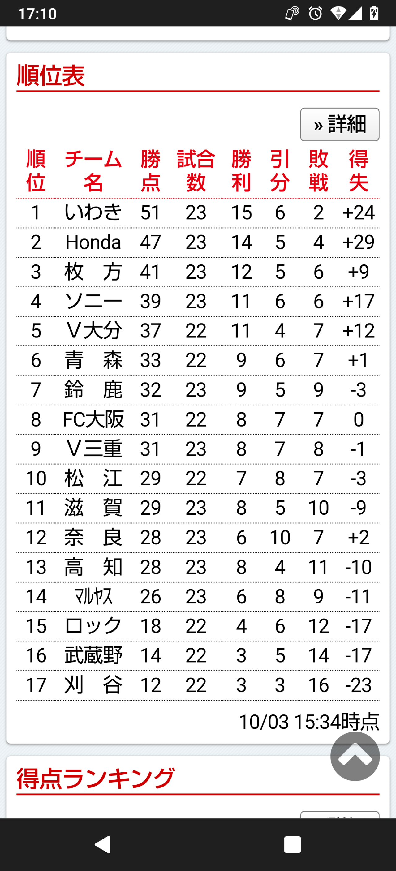 3 枚方 41 +9 12☆奈良 28 +2
