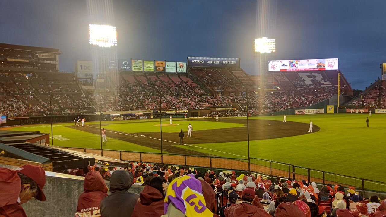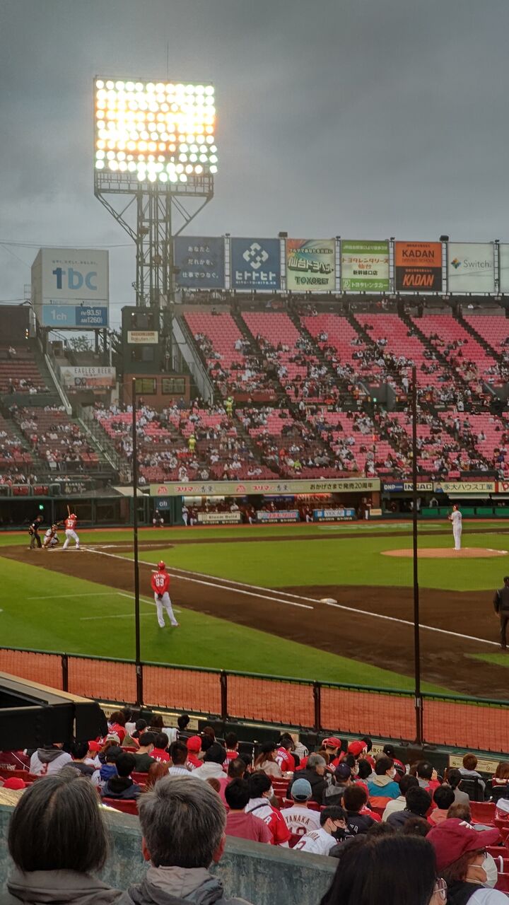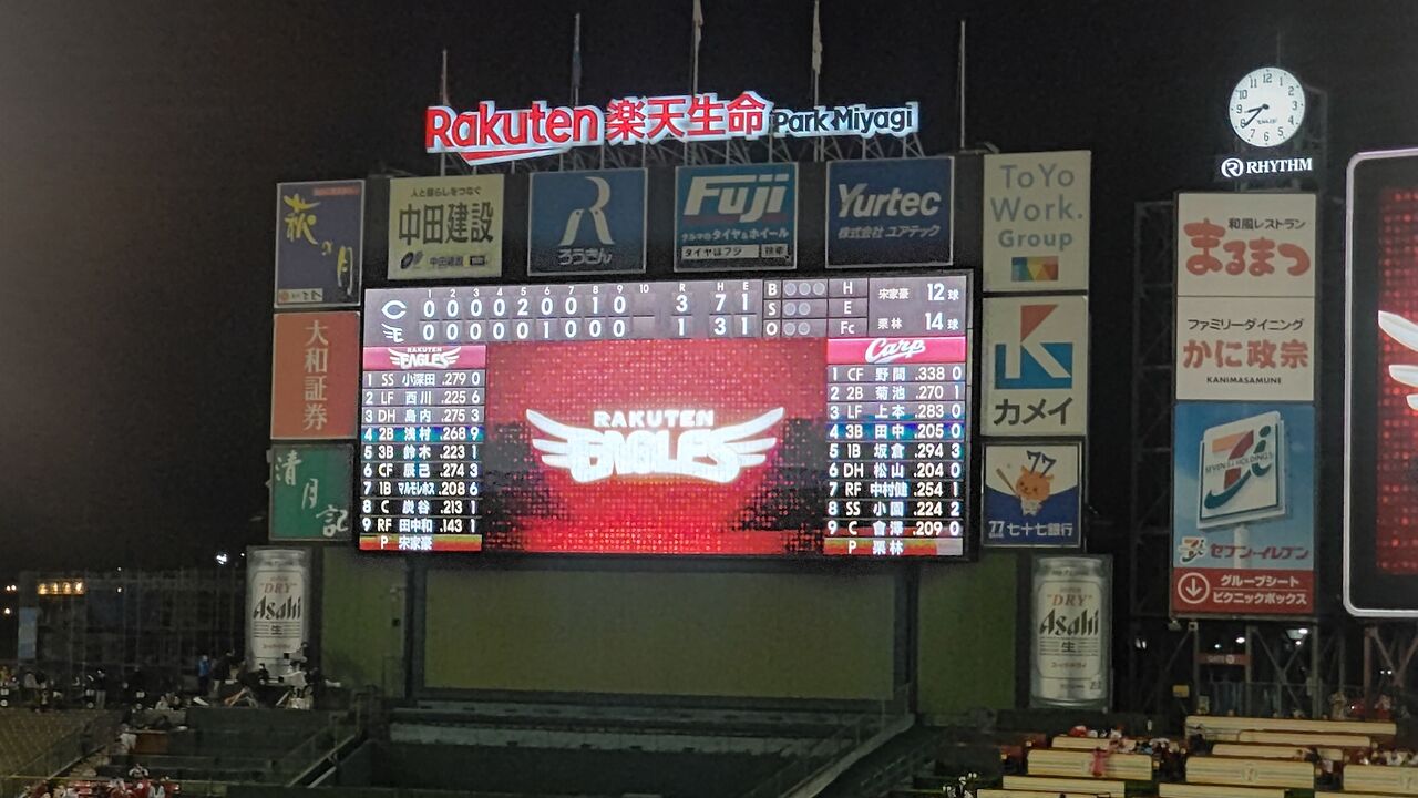 昨日から雨。交流戦も最終週。予備日もあるので、日程的には中止にしても問題はないが。。。果たして、試合開始前には雨も上がり、試合中もちょこっと降った程度。◎日清のどん兵衛ナイター プロ野球日本生命第17回セ・パ交流戦 東北楽天ゴールデンイーグルスvs広島東洋カープ 1回戦(東北1敗) 2022年6月7日(火)18時 県営宮城球場 曇一時雨 球審:笠原 14558人 2時間37分