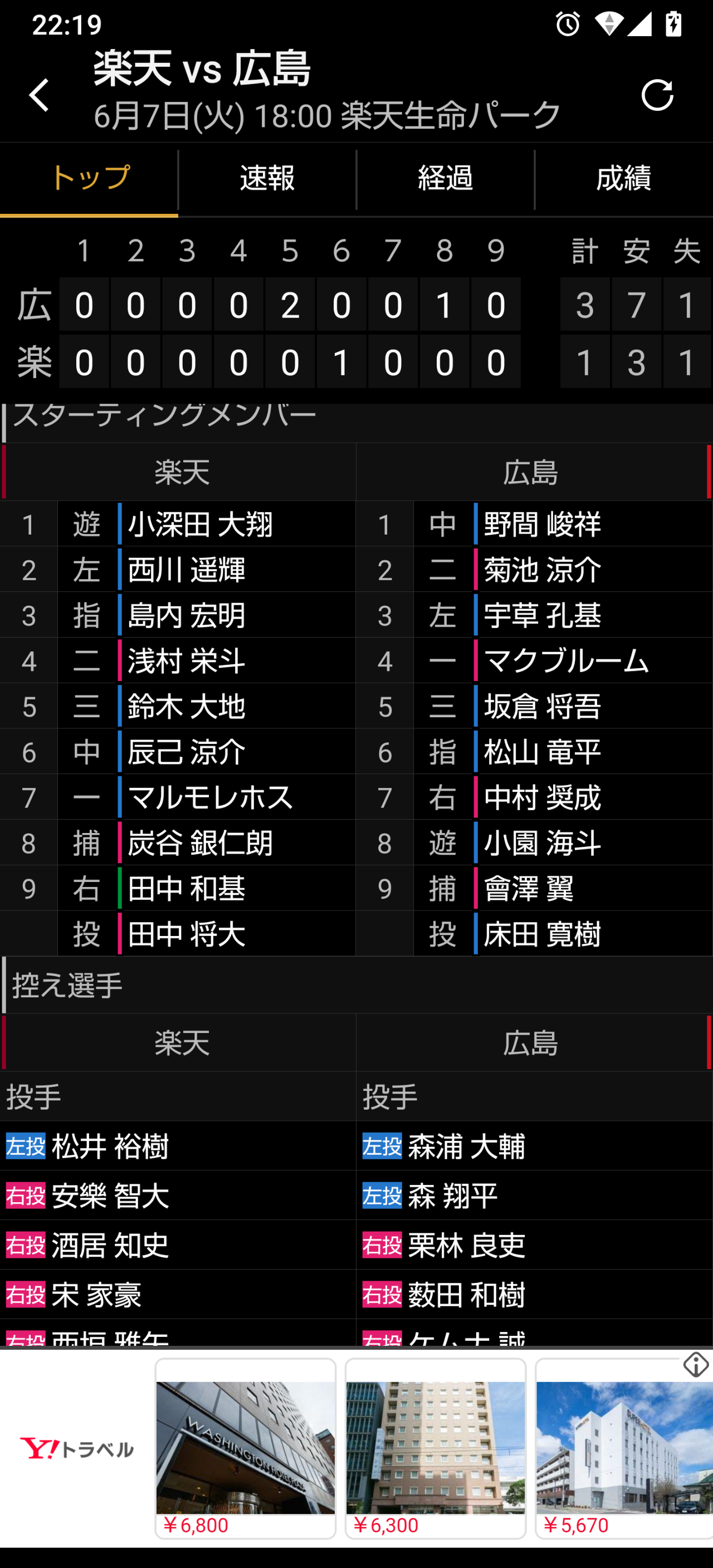 【勝/お立ち台】床田6勝3敗【S】栗林1敗12S【敗】田中4勝5敗【広島】床田[7]、森浦[1]、栗林[1]−曾澤