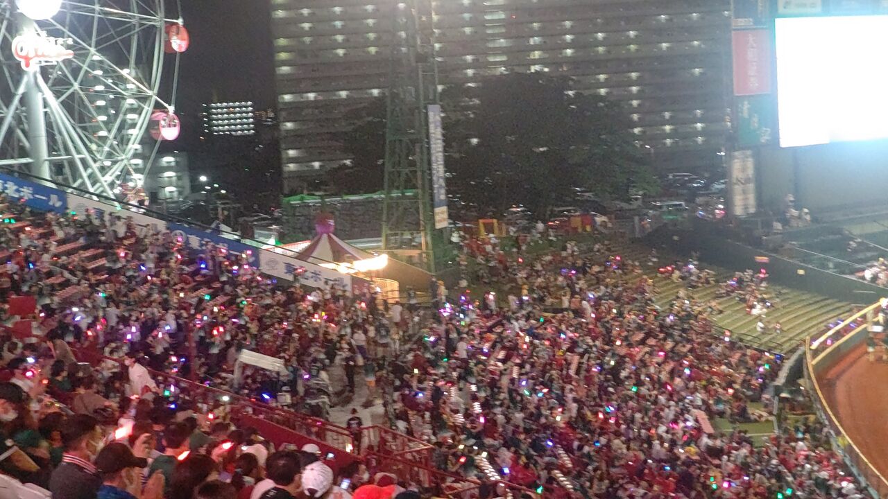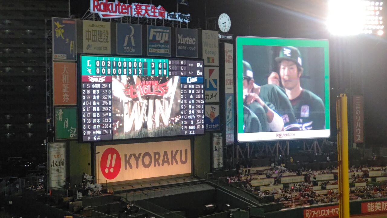 いやー、久々にというか、今年初か?ビクトリーセレモニー、そしてお立ち台まで見てから帰ったのは。これで、イーグルス戦は俺は7勝14敗5中止。