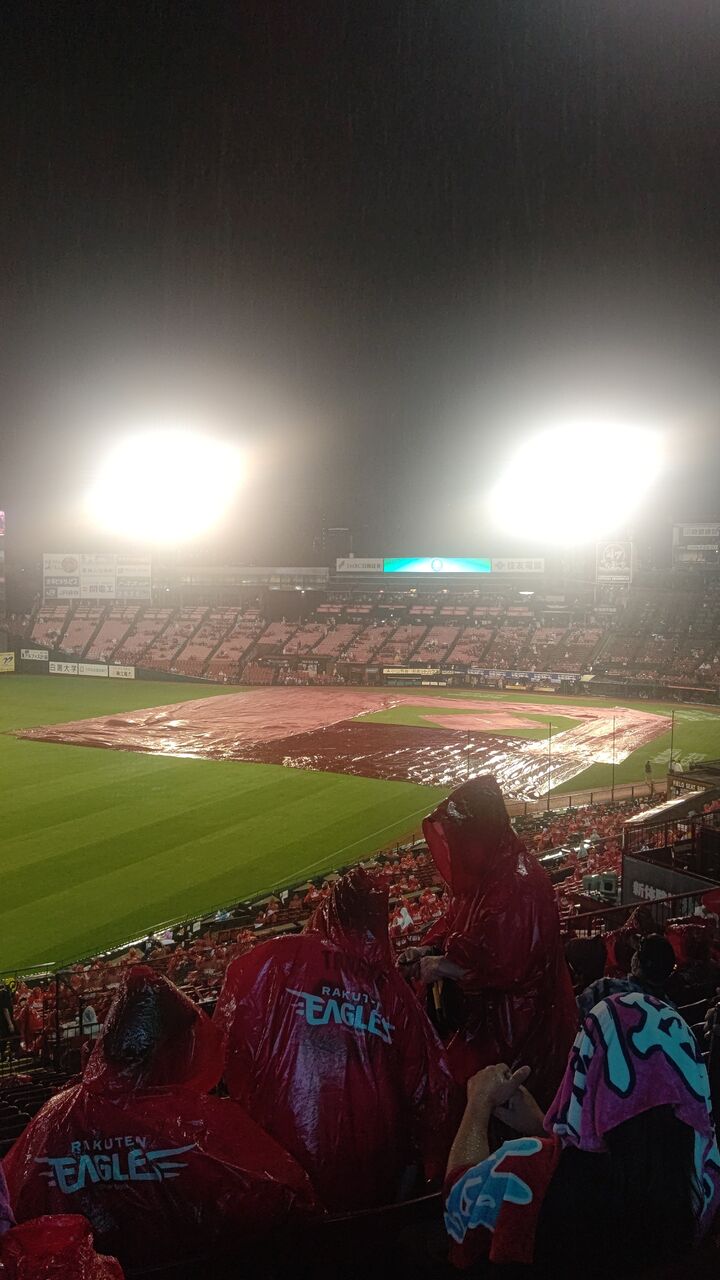 5回あたりから雨が降り出し、コンコースでポンチョを買おうと思ったら50名以上の列がwwwようやく俺の順番に回ってきて、ポンチョを買って、着て、スタンドに戻ったと思ったら、6回裏攻撃中、雨で試合中断www