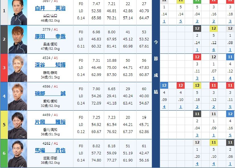 枠 登録番号/級別 氏名 支部出身地年齢体重F数 L数 ST今回成績12/17賞金順位