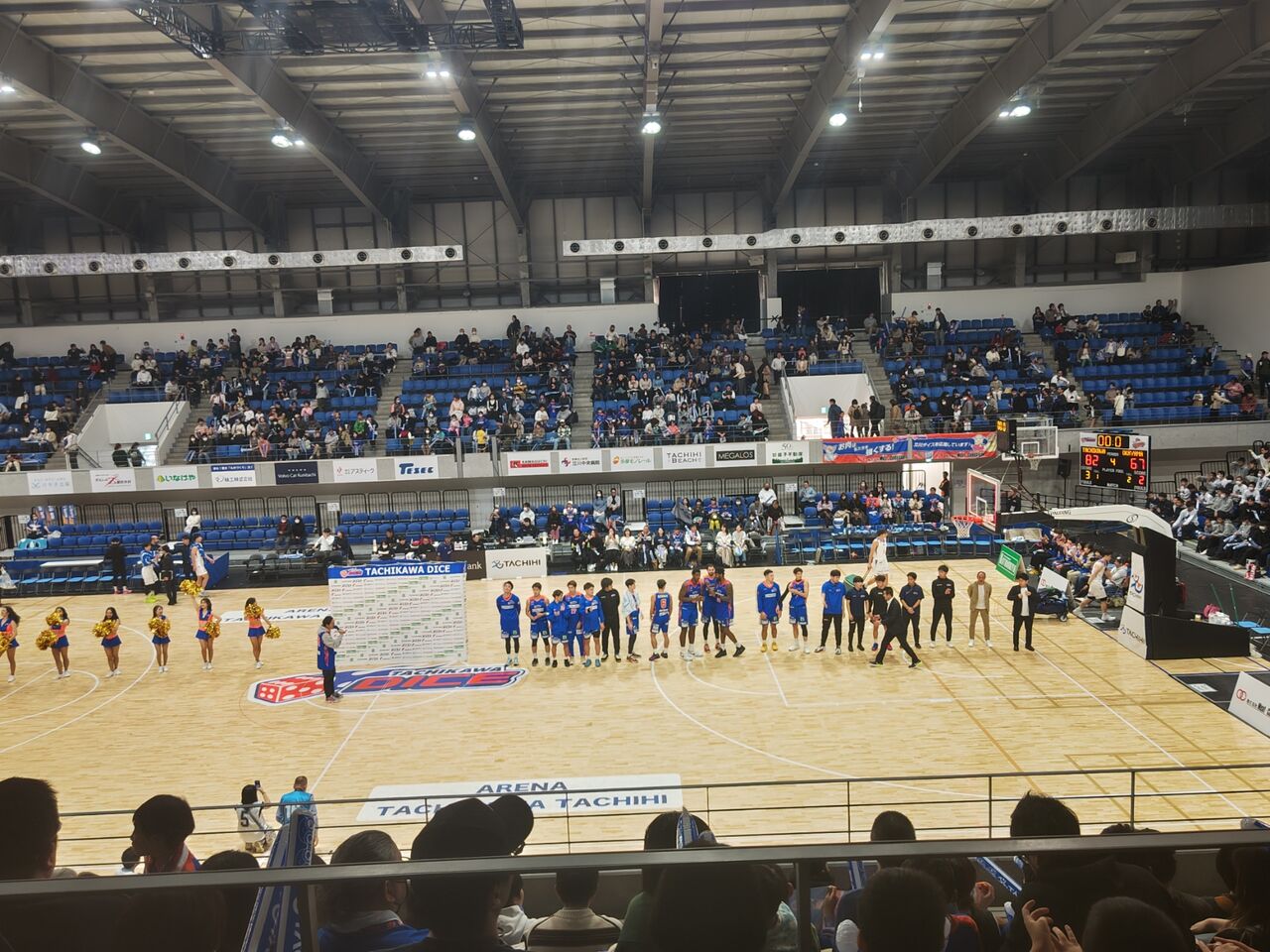 収容人数が3000人。しかし、2F席が四方にあり、しかも(位置が)高いので、見やすいことこの上ない。しかも、立川ダイスは、全試合をこのアリーナ立川立飛で行う。対するは、トライフープ岡山。