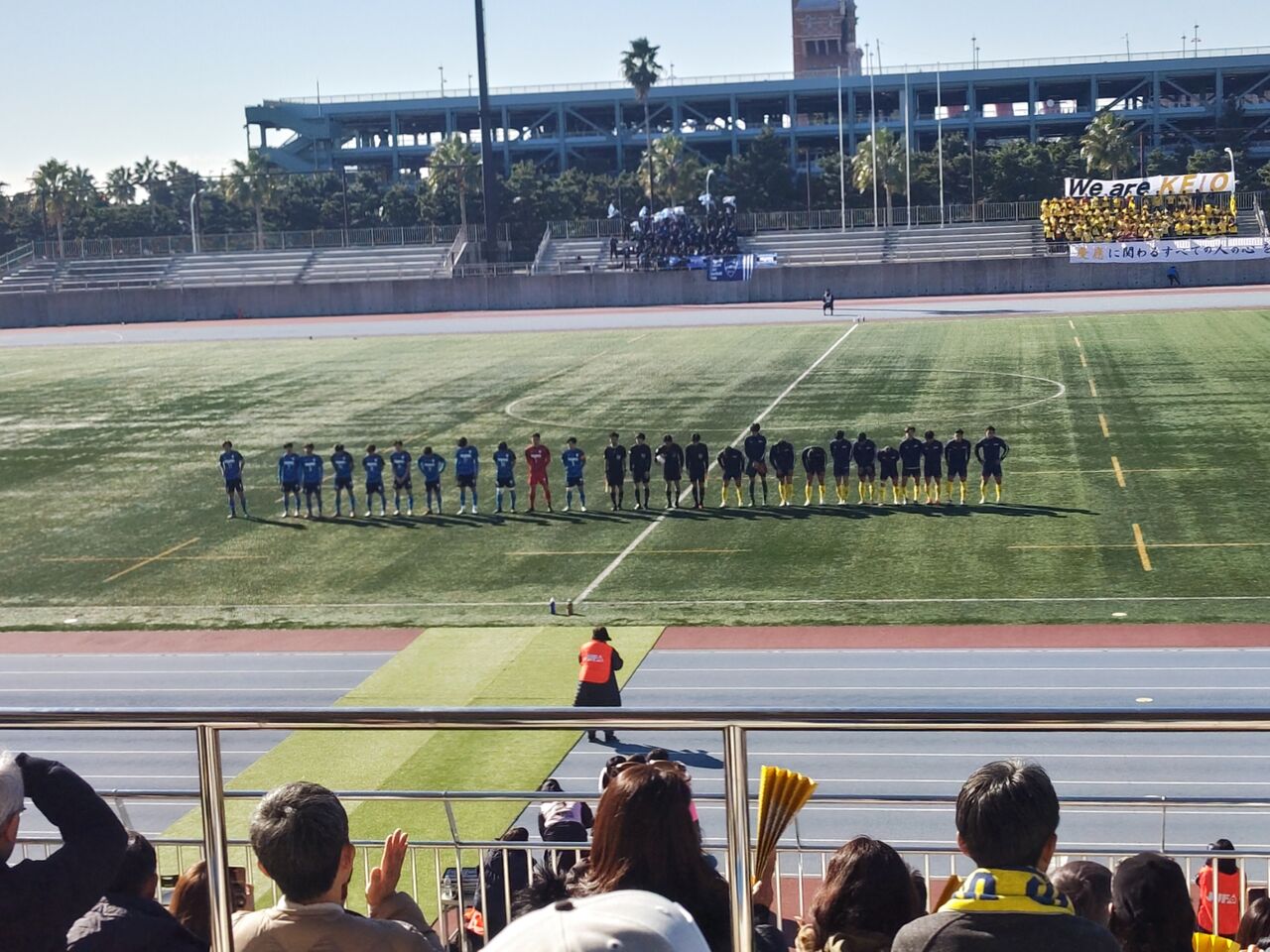 ◎2023年度関東大学サッカーリーグ戦2部参入プレーオフ決定戦 青山学院大(2部11位・青)vs慶應義塾大(3部2位・黄) 2023年12月2日(土)11時 浦安市陸上競技場(ブリオベッカ浦安競技場) 晴 16.8℃ 22% 風:微 芝:人工芝 主審:地主尚和 副審:塚本勇人、高野壮太 4審:三品敢 450人