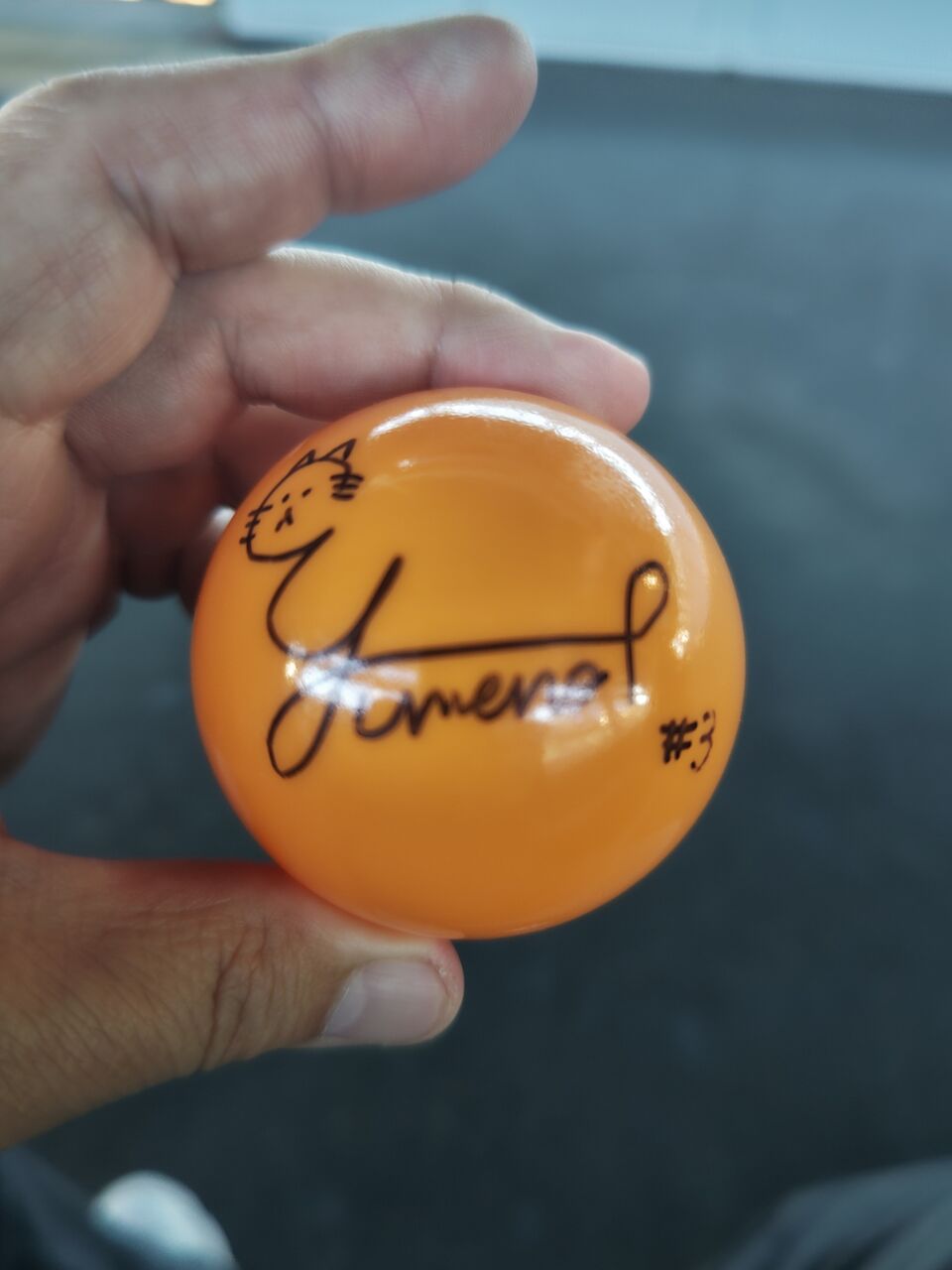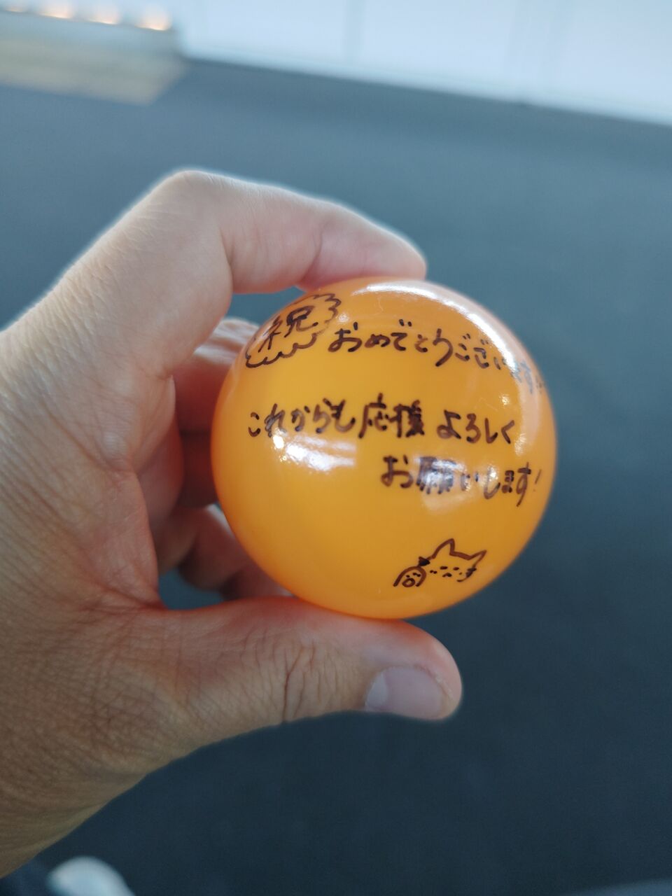 試合終了後、抽選会があって、ポスターだの、(エンゼルクロス選手全員の)サイン色紙だの、全部で当選が60人。観衆を考えると、3人に一人は当選したことに。俺は、サインボールが当選ということで、まさか、サイン入りの「バレーボール」でもくれるのか?太っ腹やな、と思ったら、いわゆるゴムボールだった。