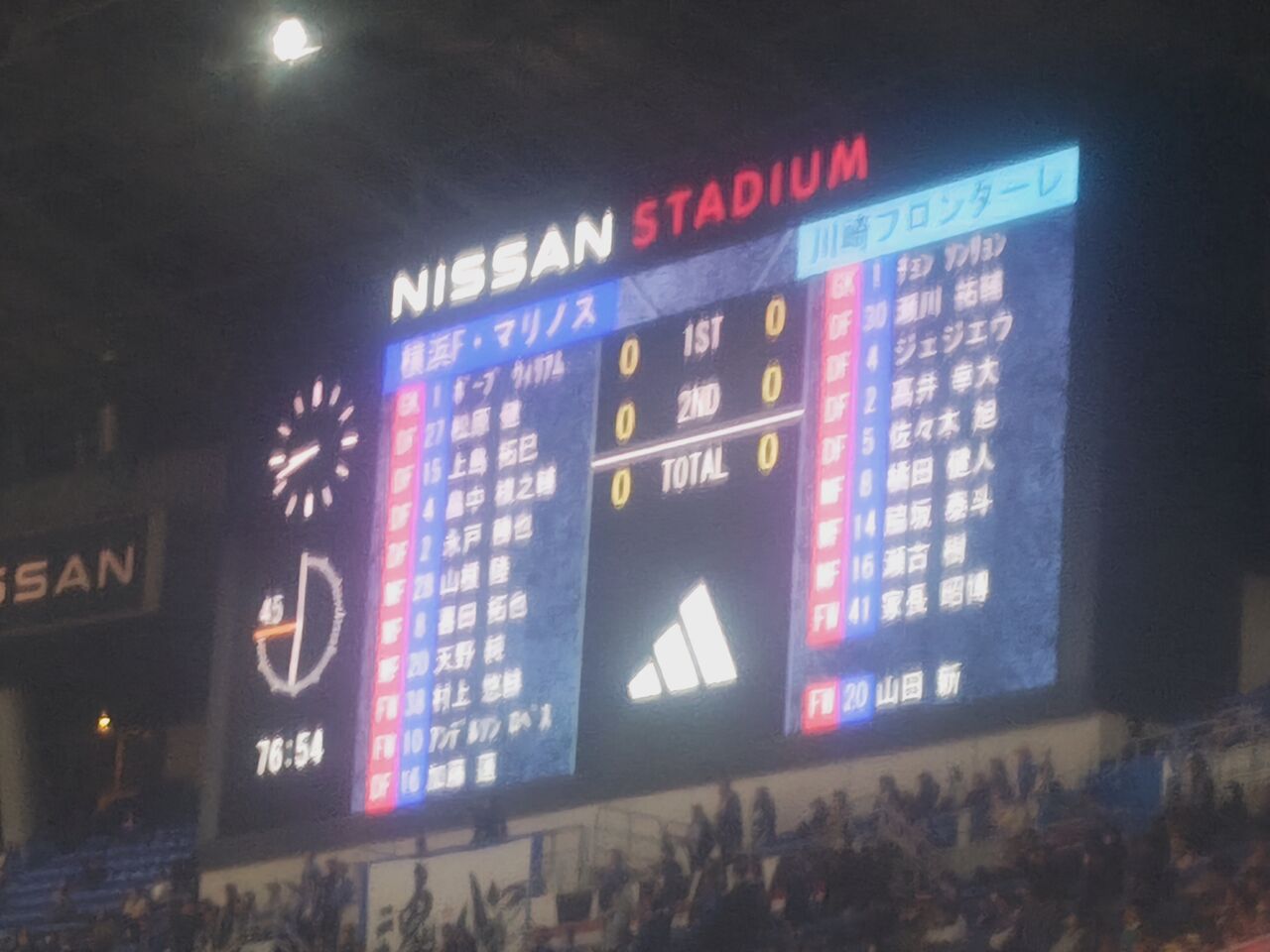 オクでただ券落として行ったら、バックスタンド1F。横国でバックスタンドで観るのは32回目にしてたぶん初めてだが、雨が。。。まぁ、そんな気にもならんかったけども。◎第32回J1リーグ戦第6節 横浜F・マリノスvs川崎フロンターレ 2024年4月3日(水)19時3分 横浜国際総合競技場 雨のち曇 風:弱 13.9℃ 82% 芝:全面良芝 表面:水含み 主審:木村博之 副審:梅田智起、坂本晋悟 4審:内山翔太 26031人