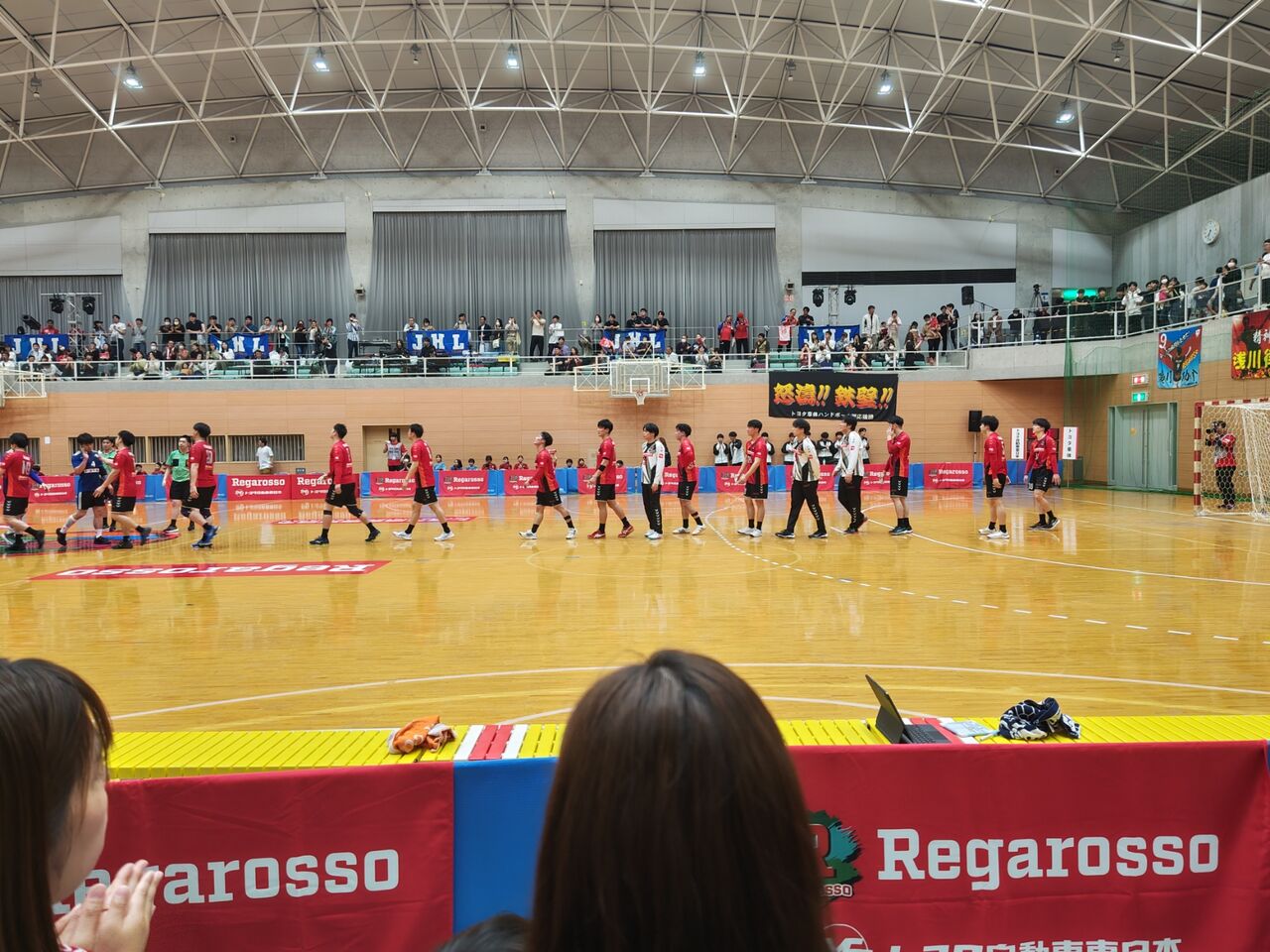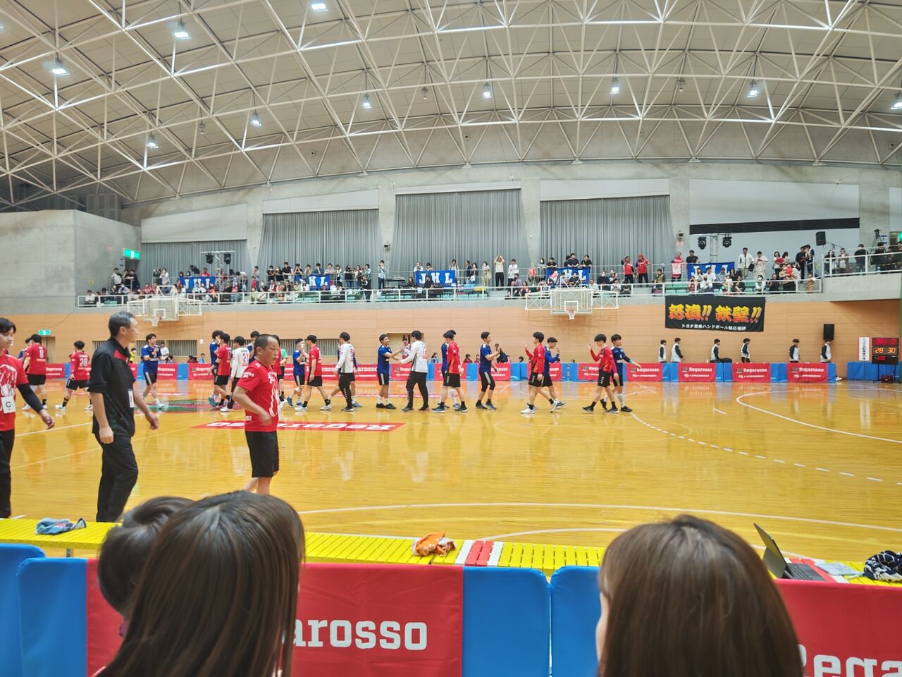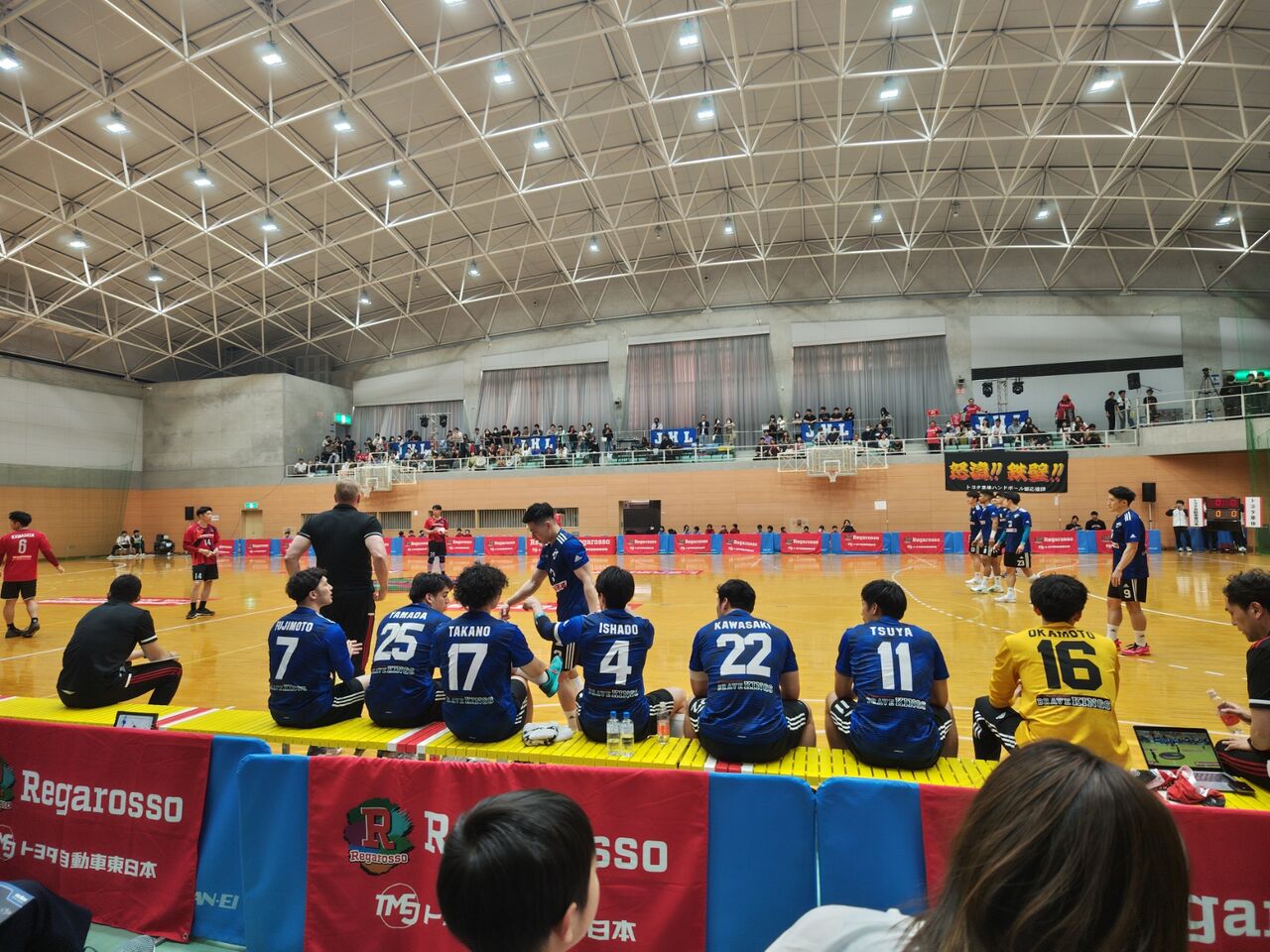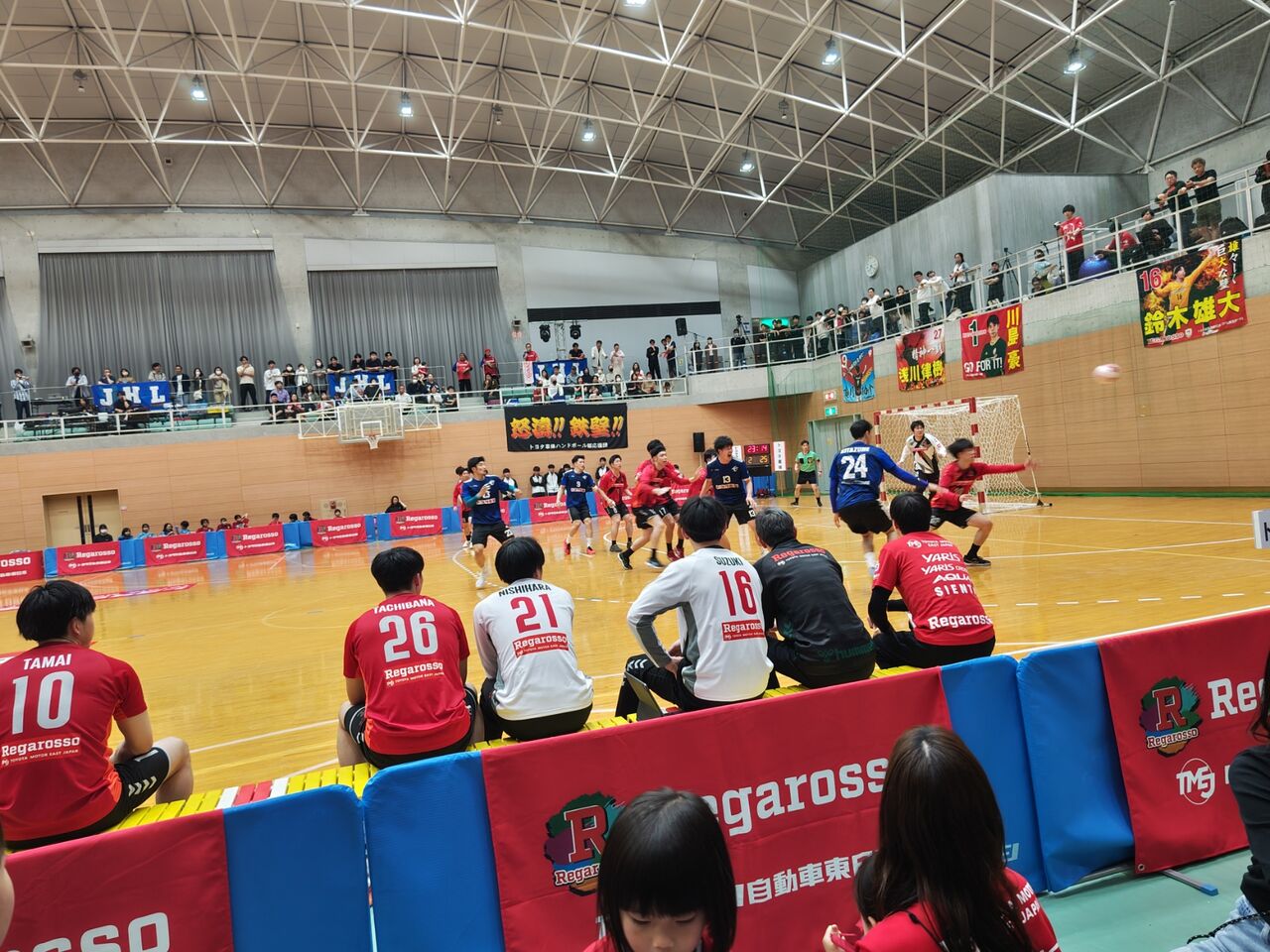 ◎第48回日本ハンドボールリーグ宮城大会第33週第1日 トヨタ自動車東日本レガロッソ(赤)vsトヨタ車体ブレイヴキングス(青) 2024年5月3日(祝)18時 フラップ大郷21 審判:白旗成、柳谷諒 518人 公式記録