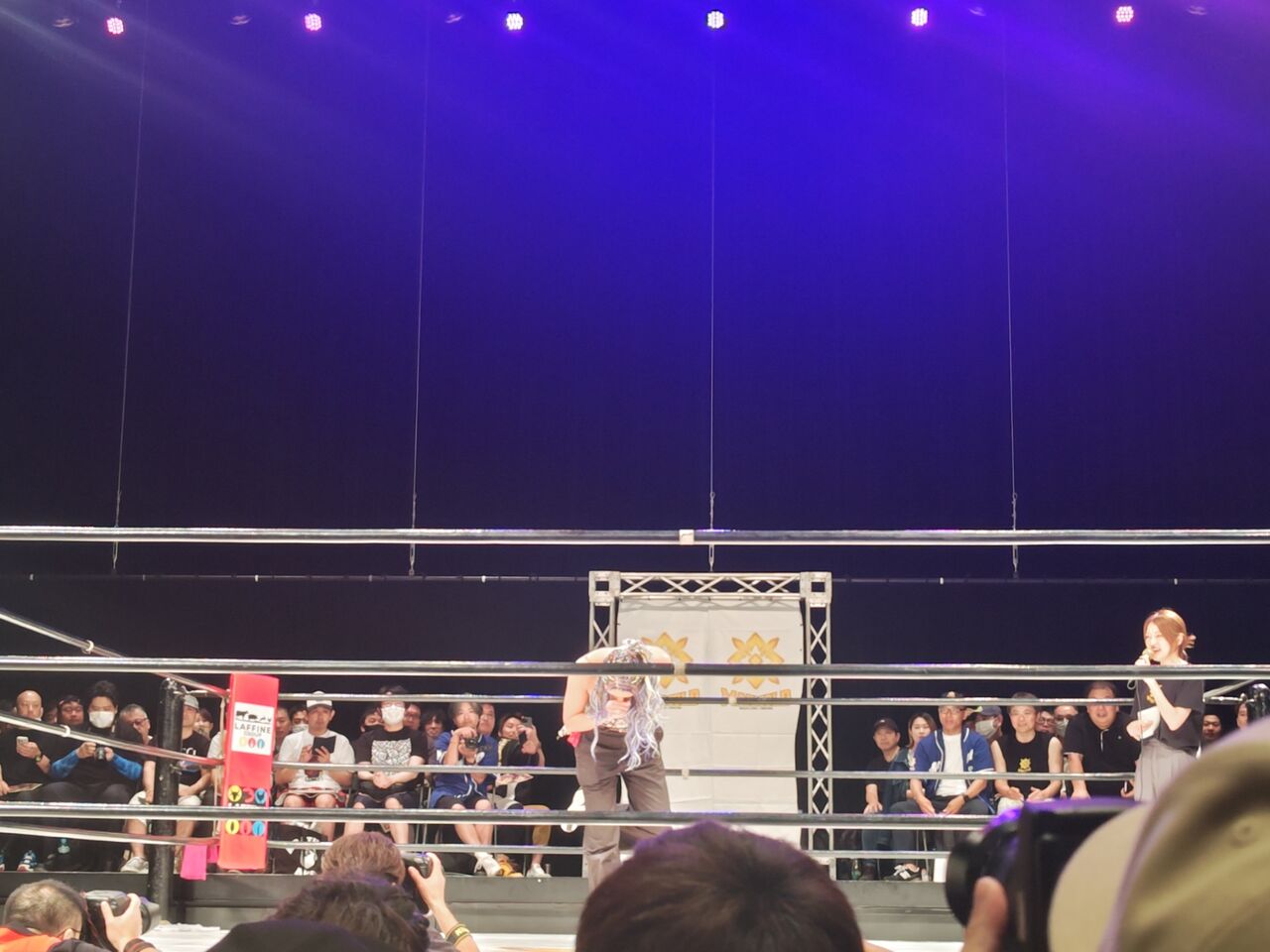 試合開始5分前から、男性のDJが場内を盛り上げているんで、その人がリングアナもやるのかと思ったら、リングアナは別にいたw