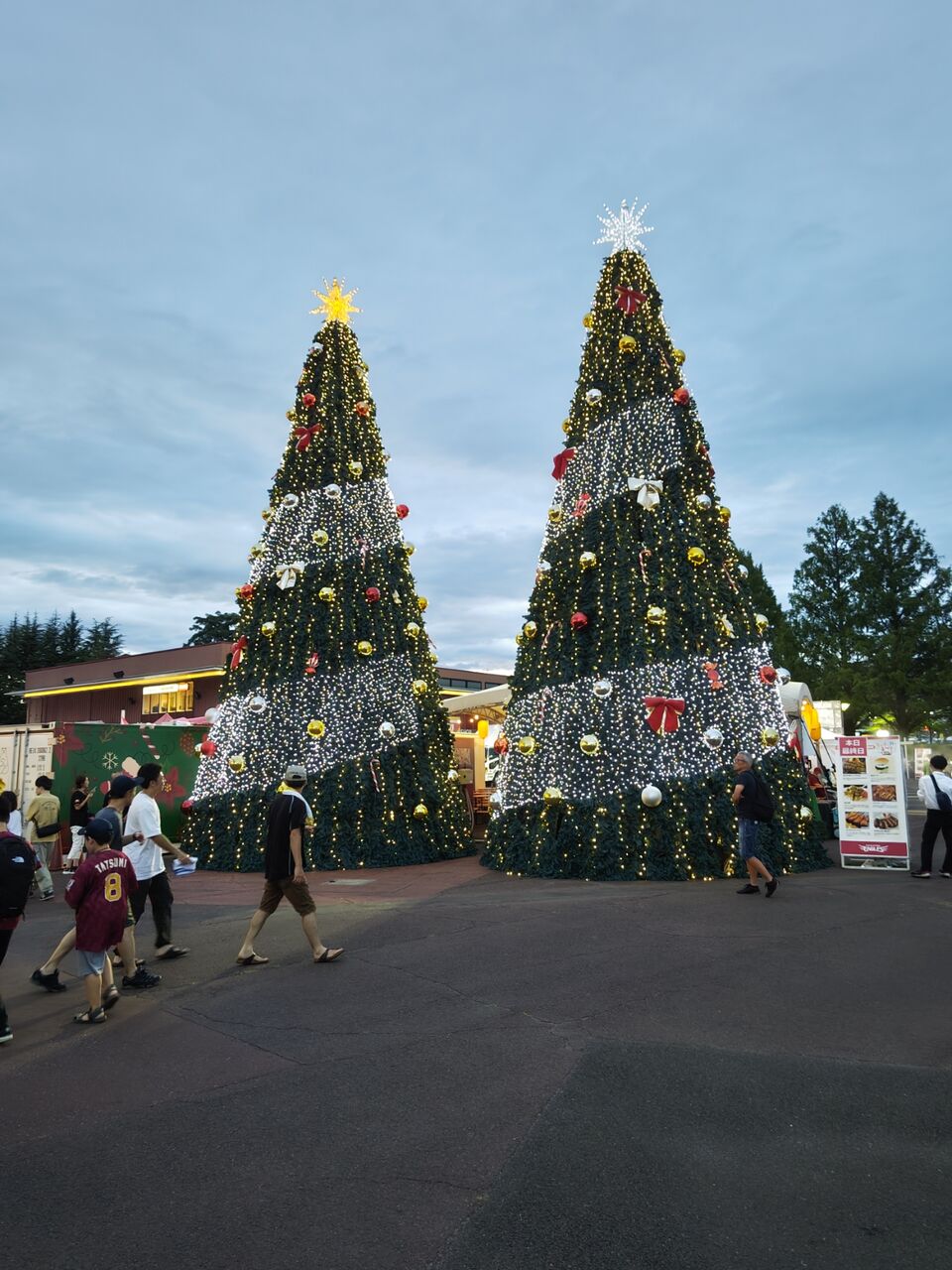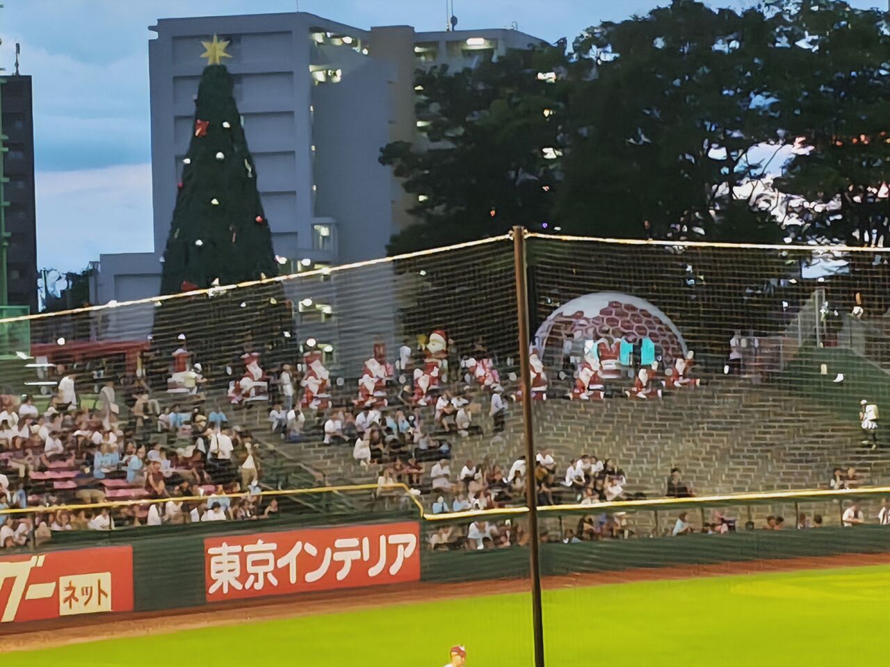 あれ?真夏のクリスマス、昨日で終わったはずなのに、クリスマスツリーはまだあるし、5回裏には(花火は上がらないけど)クリスマスショーが。昨日まであちこちに散らばっていたサンタは、グリコパークに勢ぞろいw