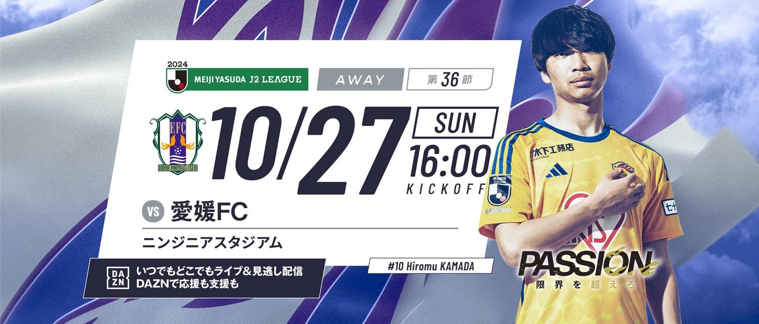 ◎明治安田マッチデー 宇和島市デー 第26回J2リーグ戦第36節 愛媛FCvsベガルタ仙台 2024年10月27日(日)16時3分 愛媛県総合運動公園陸上競技場(ニンジニアスタジアム) 曇 24℃ 78% 主審:大橋侑祐 副審:田尻智計、田代雄大 4審:堀善仁 4089人