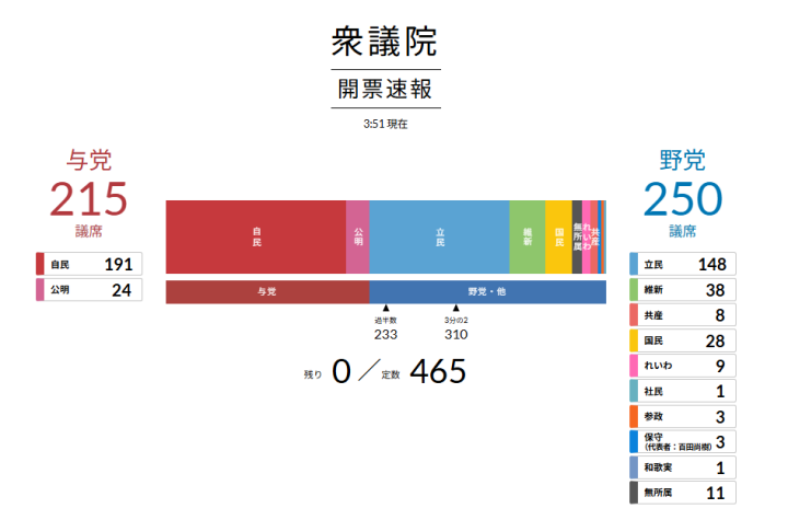 で、全国的には、自民・公明で過半数割れ。。。議席こそ、自民党が第一党ではあるが。