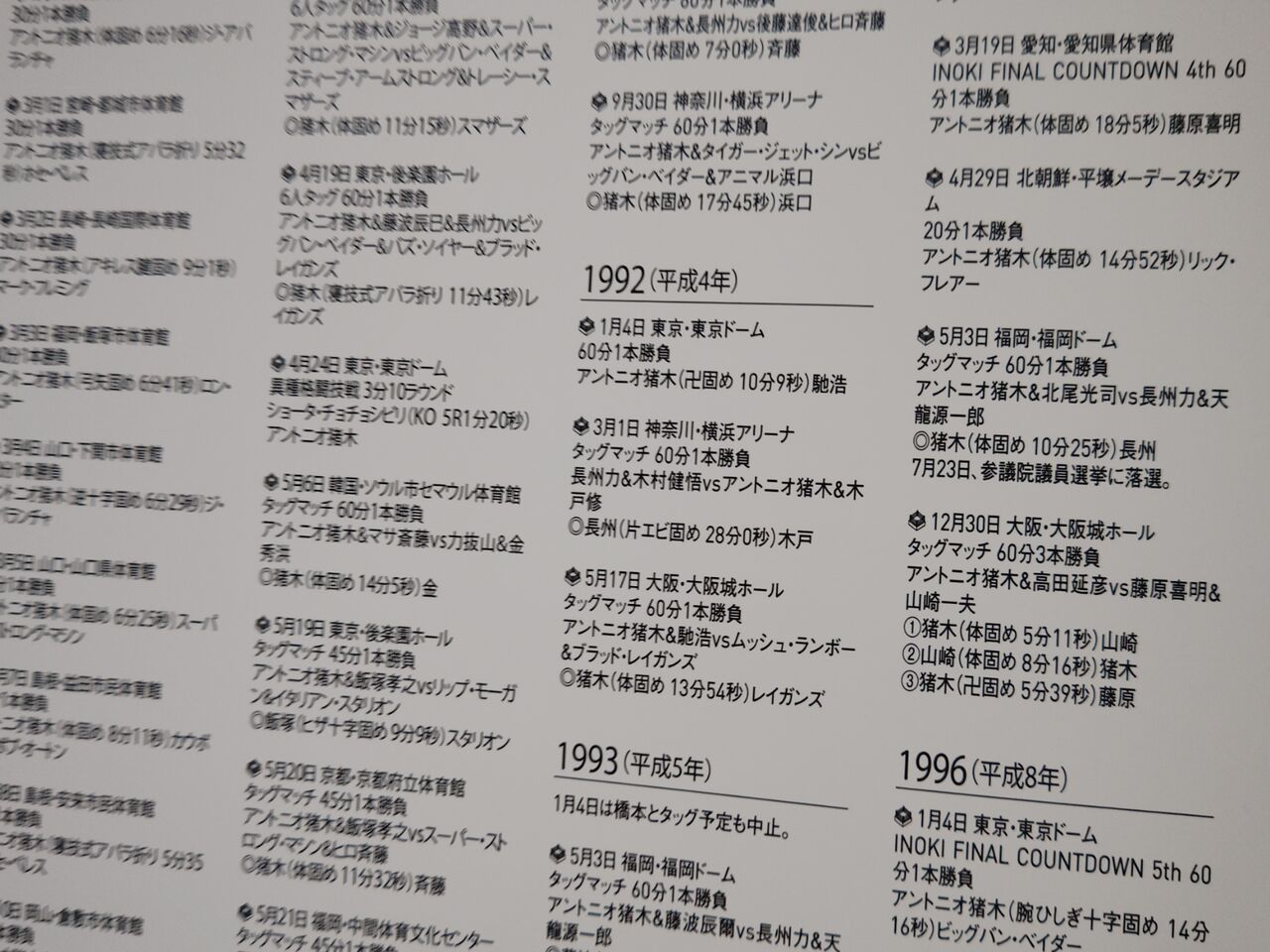 ・・・アントニオ猪木の全試合結果が出ている。俺が最初に、猪木の試合を現場で見たのは、たぶん1992.1.4。馳とのシングルだったな。この日は、試合前に「白波五人男」の紹介(闘魂三銃士+馳健)もあったな。卒論の締め切りが1月7日で、その状況で新幹線で東京往復したっけ。というか、新日本を見たこと自体、この日が初、か?