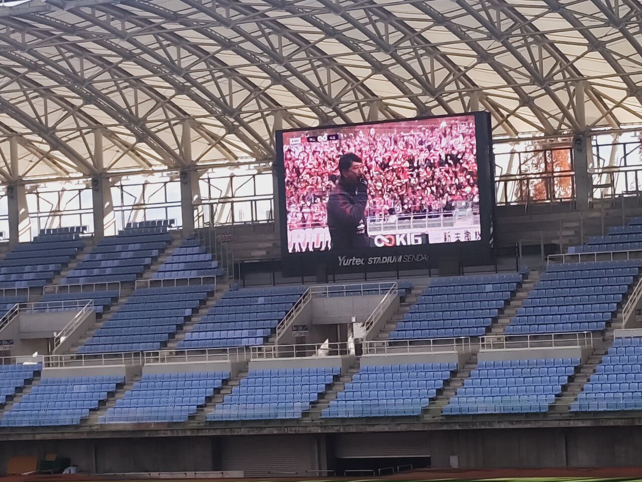 12時半に仙台スタジアム到着。PVだが、端の方から声出し応援が。◎at Lifeデー J1昇格プレーオフ決勝 ファジアーノ岡山vsベガルタ仙台 2024年12月7日(土)13時7分 岡山県総合運動公園陸上競技場(シティライトスタジアム) 晴 12.5℃ 37% 主審:上田益也 副審:熊谷幸剛、梅田智起 4審:岡部拓人 VAR:御厨貴文 14673人(完売御礼)