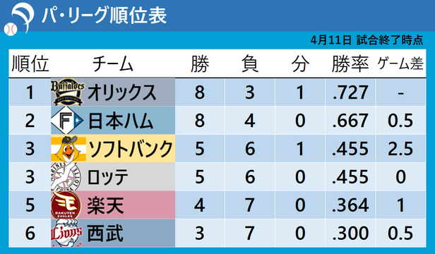 【オリックス】田嶋大[5]、阿部[2/3]、山田[1 1/3]、博志[1]、マチャド[1]−若月