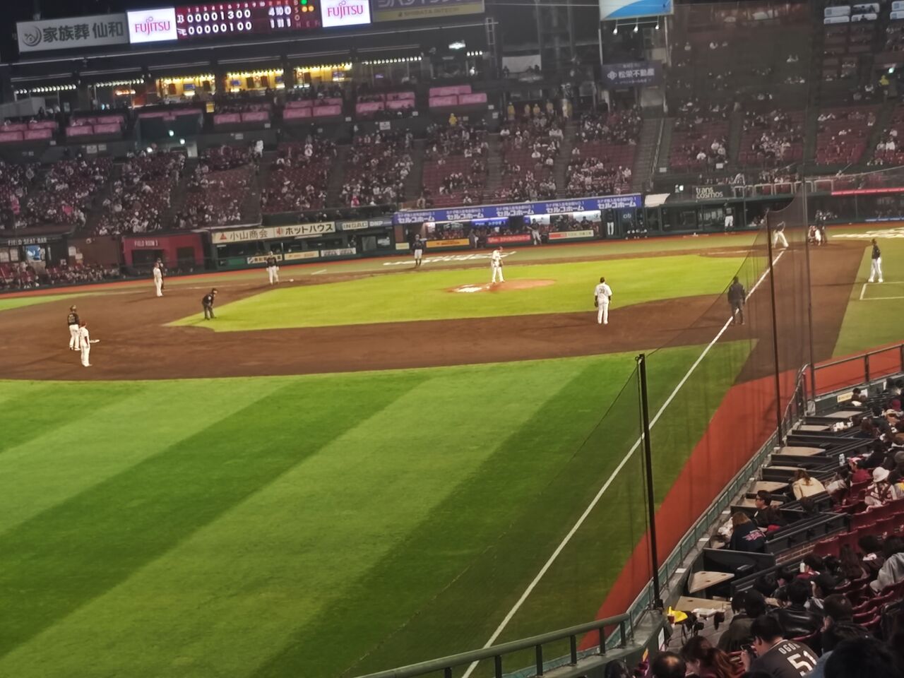 16時半に泉(南大沢)を出て、将監トンネルから、仙台市科学館を経由して宮城球場に17時半くらい。この時点でのただ券引き換えが、右翼上段(一番センター寄り)。まぁ、昨日のバックスクリーン直下よりはまだましな席。