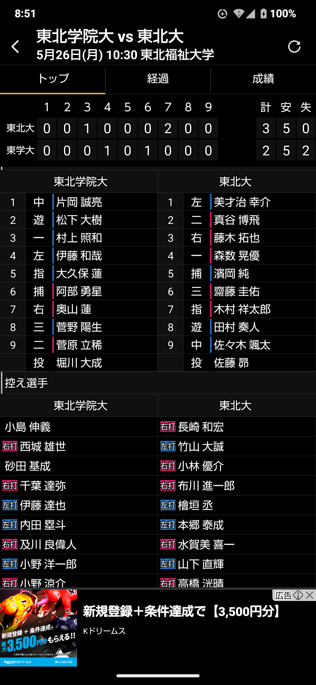 3回表。一死一三塁から、森数が右犠飛で東北大先制。