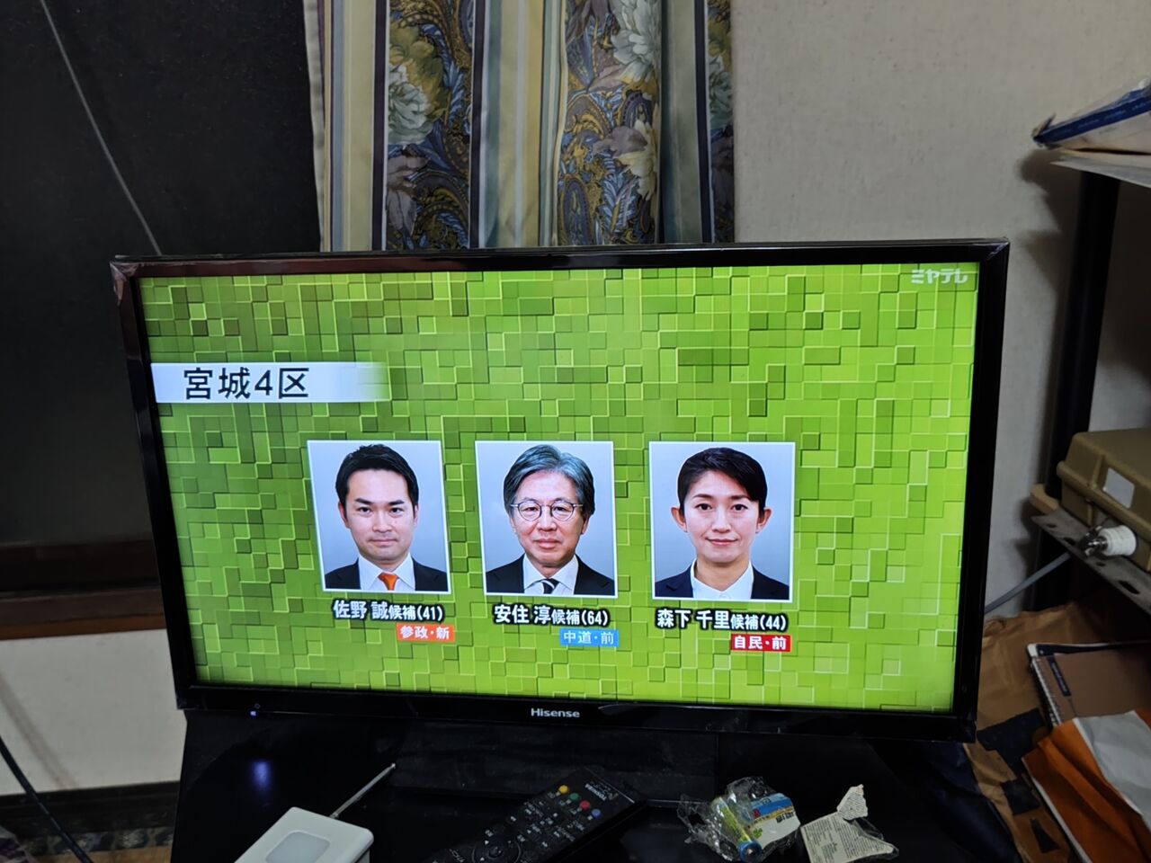 (俺の住む)宮城4区には、2024年衆院選の比例東北ブロックで初当選した自民党前議員森下千里氏(44)と、11選を狙う中道改革連合前議員安住淳氏(64)、参政党新人佐野誠氏(40)が立候補した。