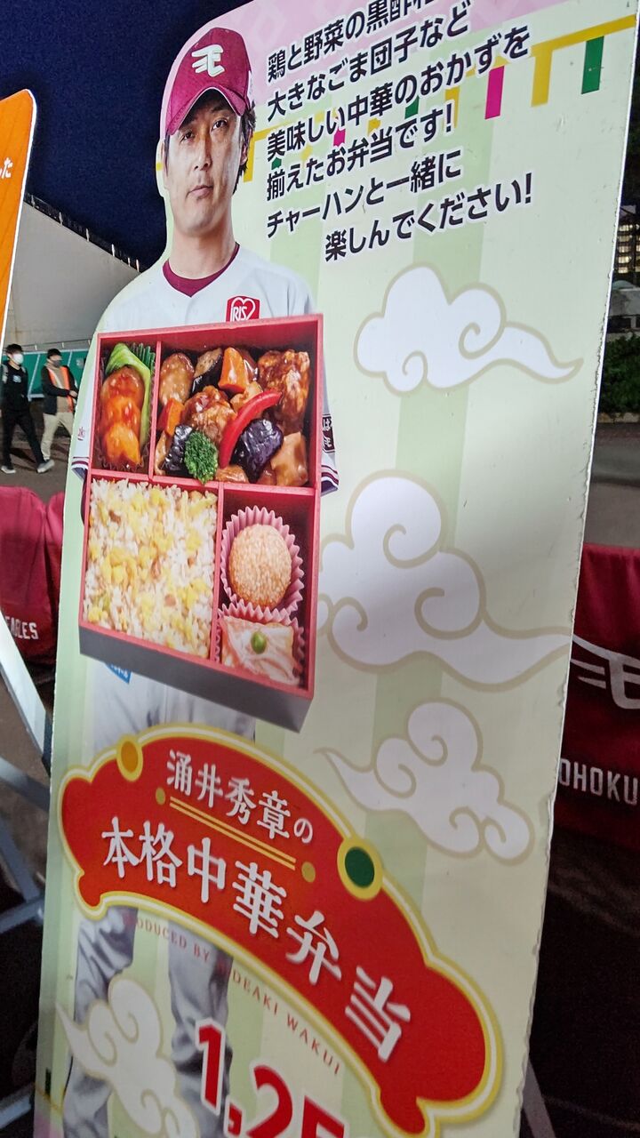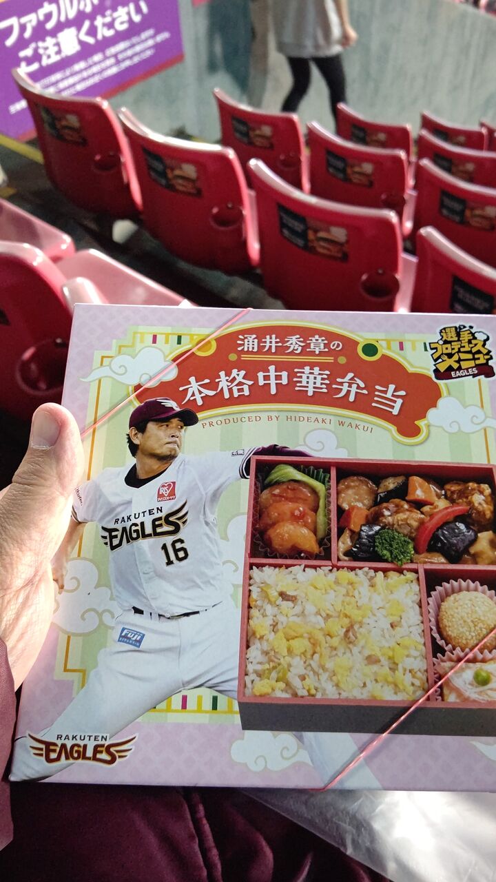 今日は最終戦だったので、石井監督弁当を食べようと思ったら、売り切れで、なぜか?涌井秀章の本格中華弁当を。