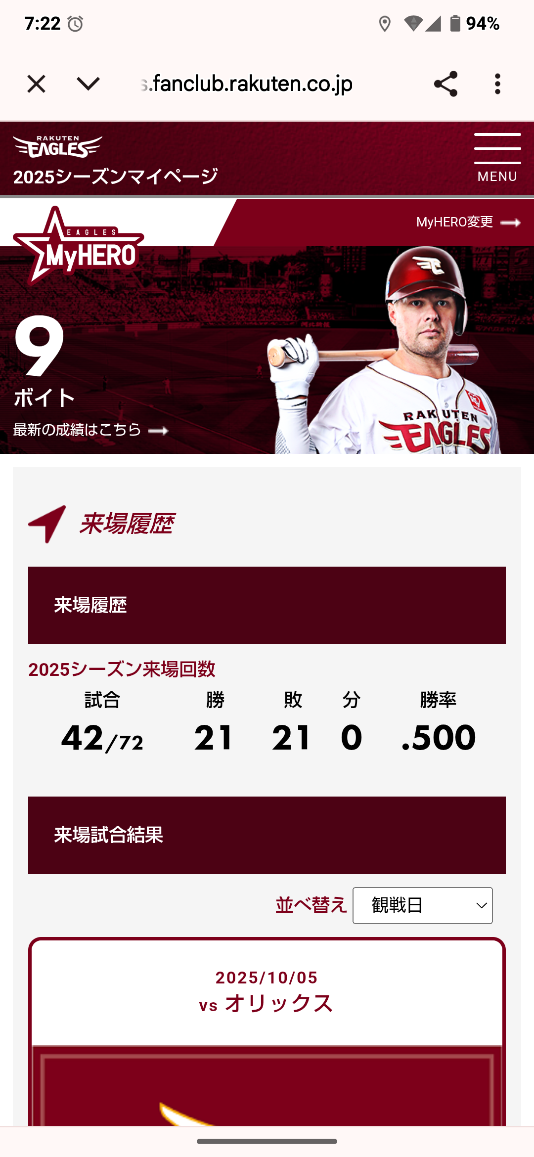 すべてホームゲーム。(写真は、イーグルスのFCマイページだが、盛岡南参戦時に来場登録をつけられなかった(つけることができることを知らなかった)ので、21勝21敗になっている。
