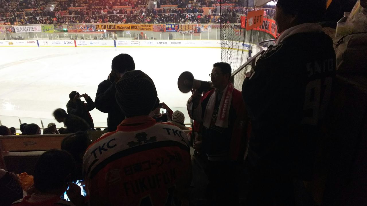 アジアリーグアイスホッケーなんだが、(東北フリーブレイズの親会社のスーパースポーツXEBIOのごり押し?で、東京ヴェルディとのコラボマッチ。ブレイズは緑ユニを着用、ヴェルディの女子ホッケーチームの選手が記念フェイスオフ、いや、ここまではいいんだが、アウェイ側ゴール裏にまで、ブレイズとヴェルディの幟が立ち、挙句の果てに全席指定で、太鼓禁止!(なので、日光の支援者はフライパン叩いてたらしいw)ブレイズのコアサポとやらはいたのか?