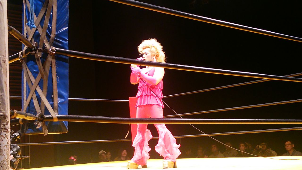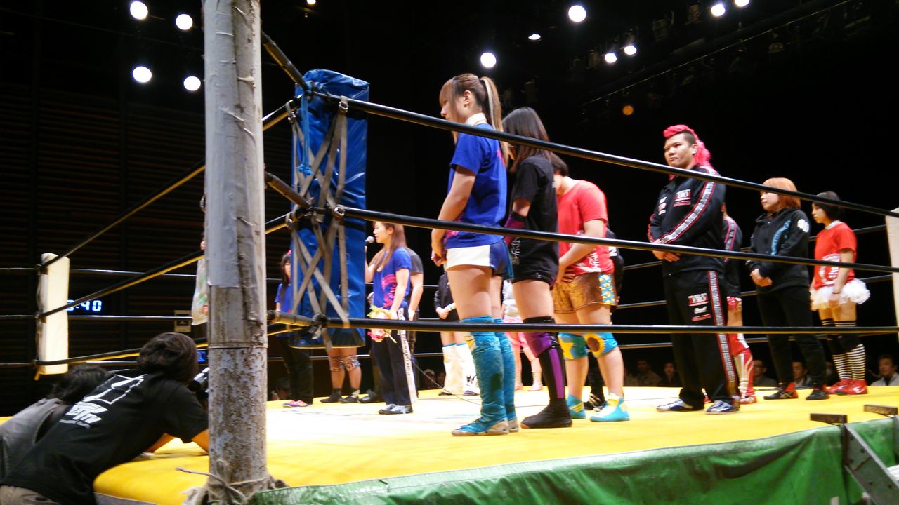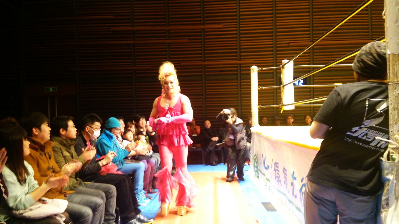 選手入場式。利府町長も、マスクを被って入場wその後、大畠美咲(宮城県出身。既に引退)と藤本つかさのトークショーが行われて、