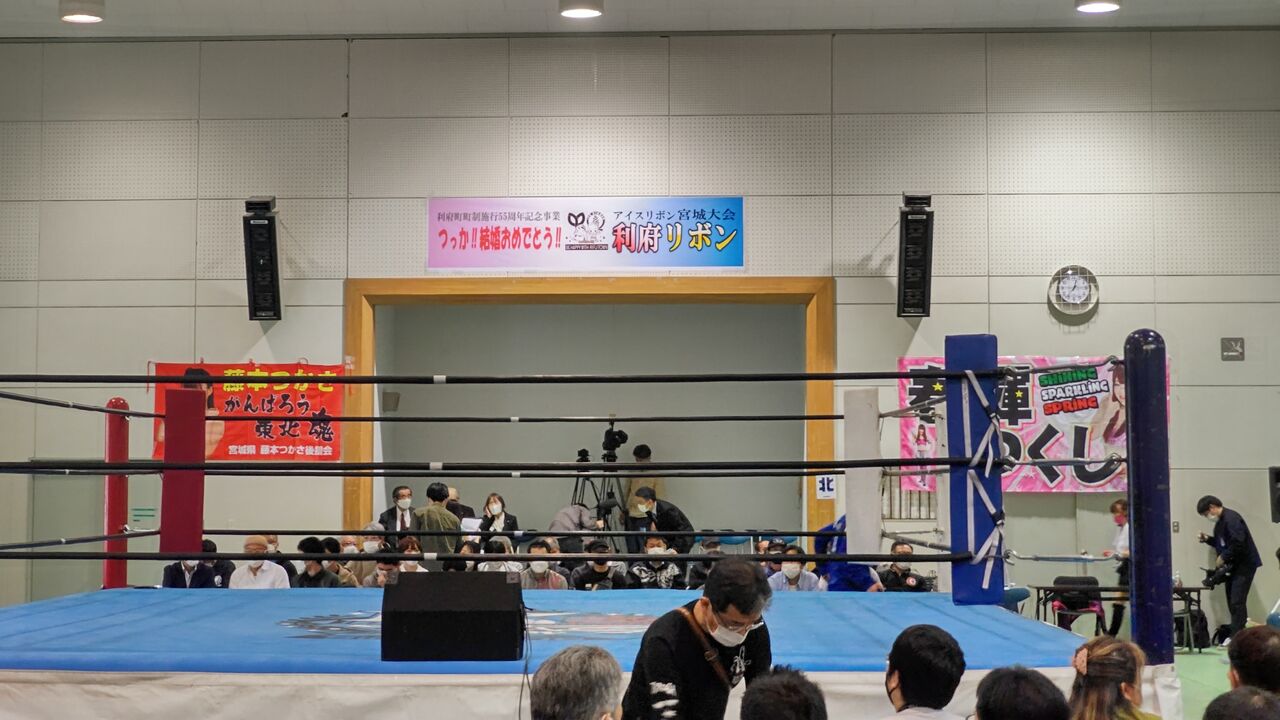 利府町観光大使を務めていた藤本つかさ(つっか)が、昨年5月だかに結婚し、そして女児を出産。去年まで毎年開催していたこの大会、どうなるかと思ったら、つっかが(今のところ)一日限定の復帰、ということでの開催となった。◎アイスリボン宮城大会「利府リボン2023」 2023年7月30日(日)13時 利府町総合体育館メインアリーナ 236人