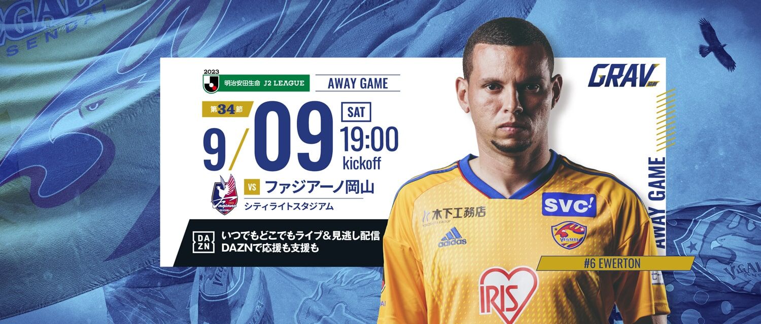 ○ELGEOデー 第25回明治安田生命J2リーグ戦第34節 ファジアーノ岡山vsベガルタ仙台 2023年9月9日(日)19時3分 桃太郎スタジアム(シティライトスタジアム) 晴 28℃ 57% 主審:窪田陽輔 副審:坂本晋悟、田島宏則 4審:西村幹也 14156人